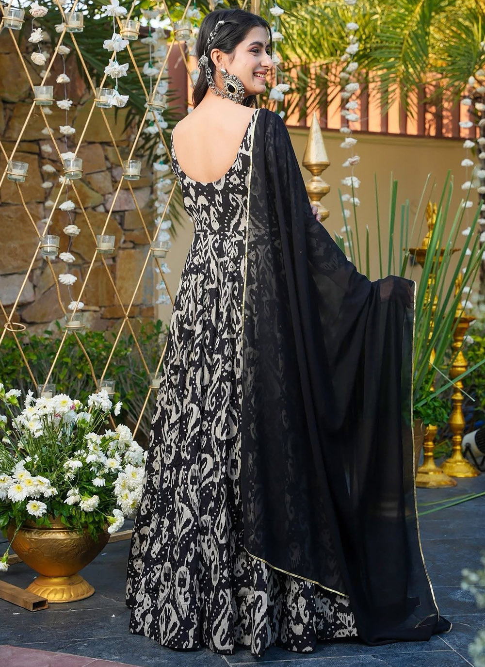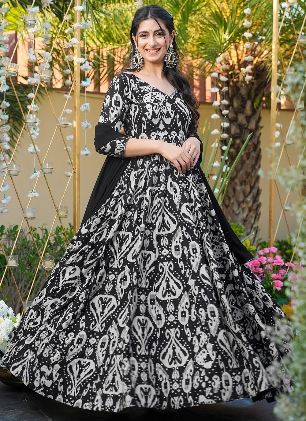 The Black Rayon Digital Print Work Readymade Gown combines contemporary design with traditional elegance. The breathable rayon fabric keeps you comfortable, while the unique digital print patterns give the outfit a trendy and eye-catching appeal. Comes with matching dupatta.
