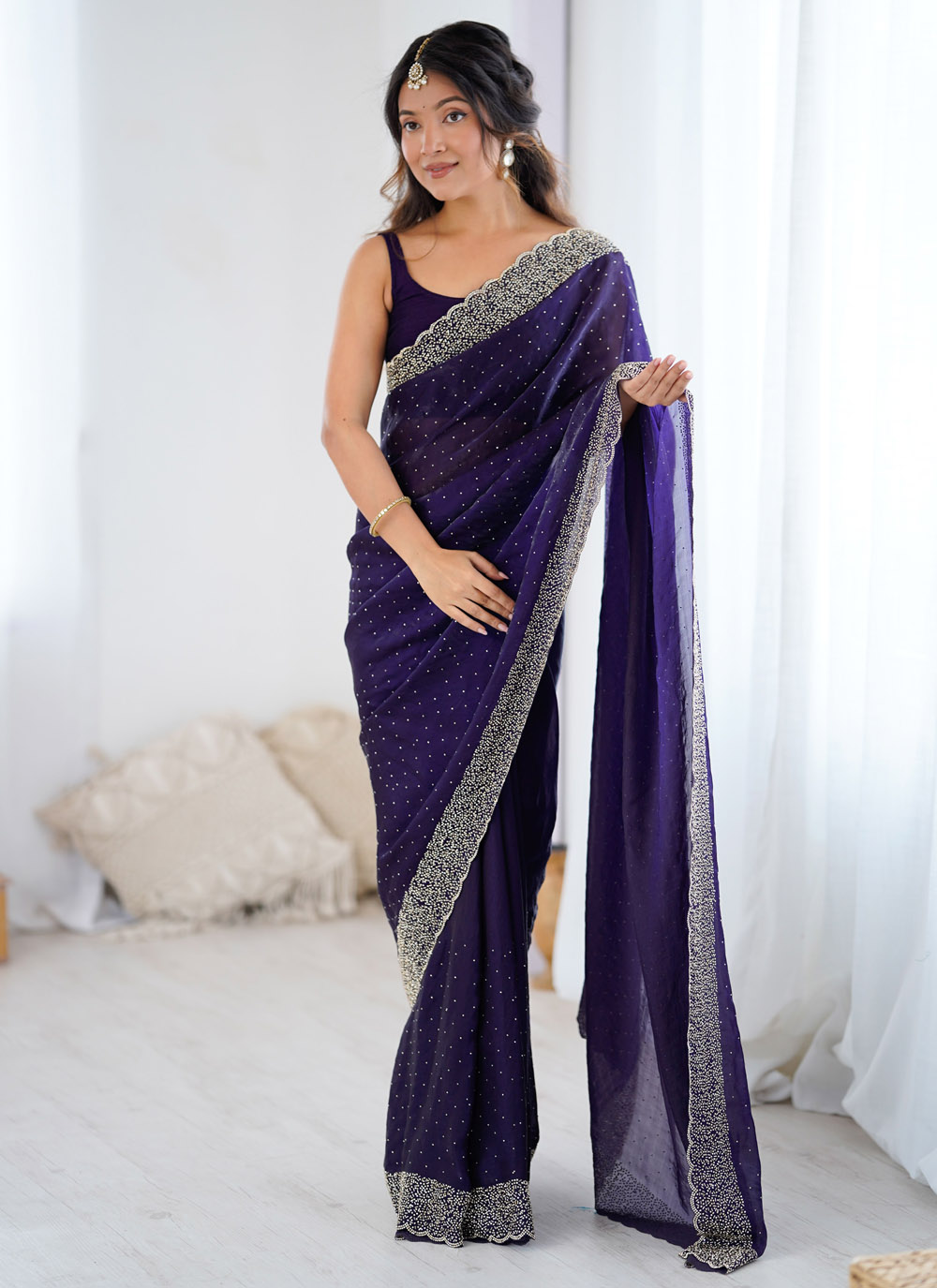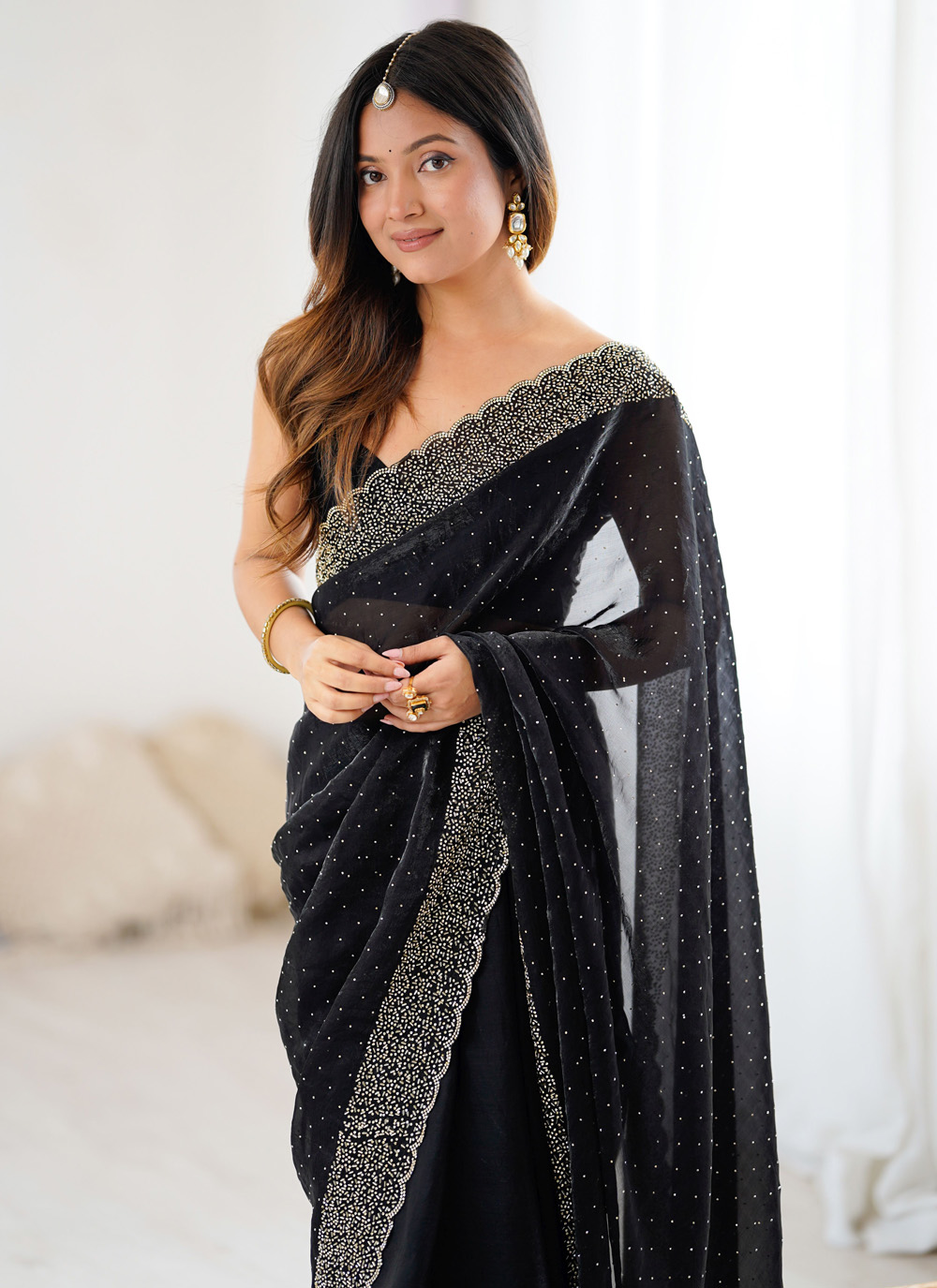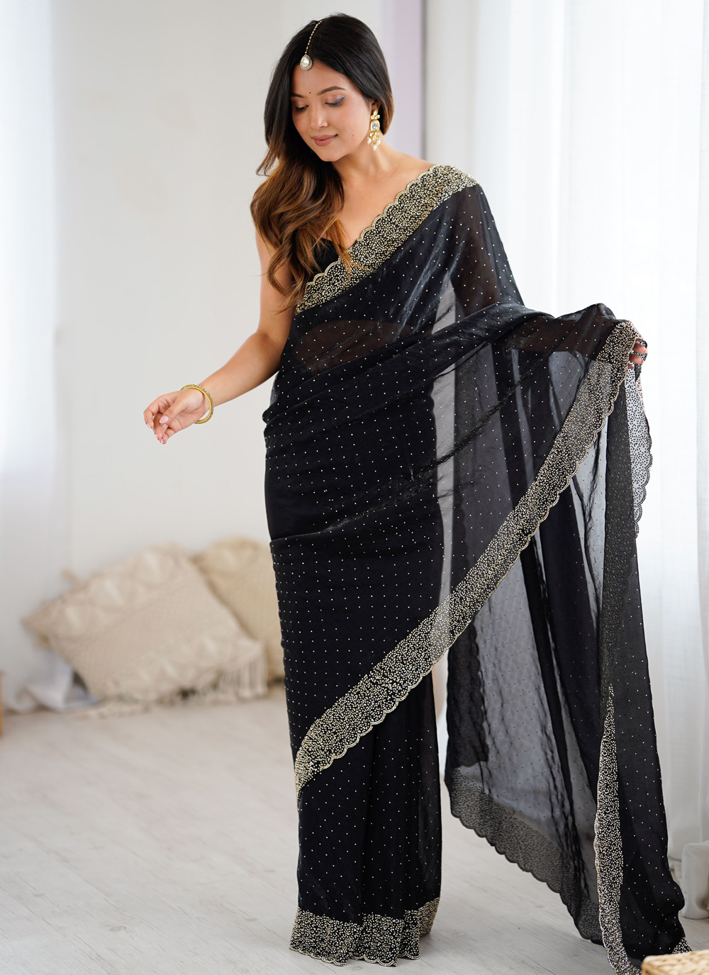 This designer black satin saree is an elegant blend of smooth texture and artistic embellishment. The carefully placed Zarkan work adds a shimmering depth that beautifully complements the rich black tone. Comes with matching blouse.