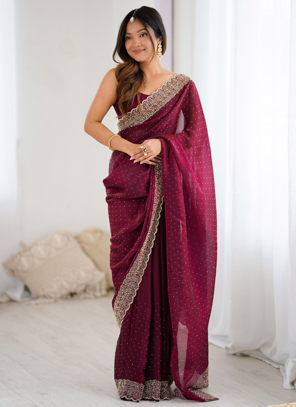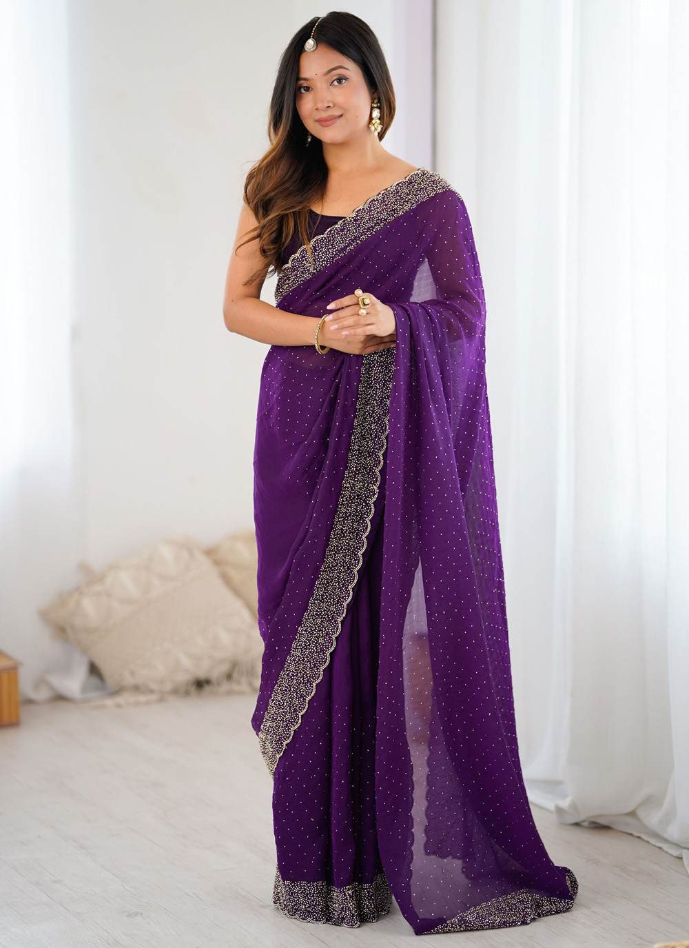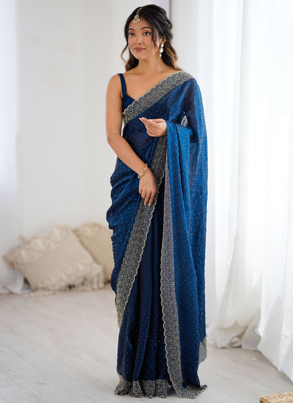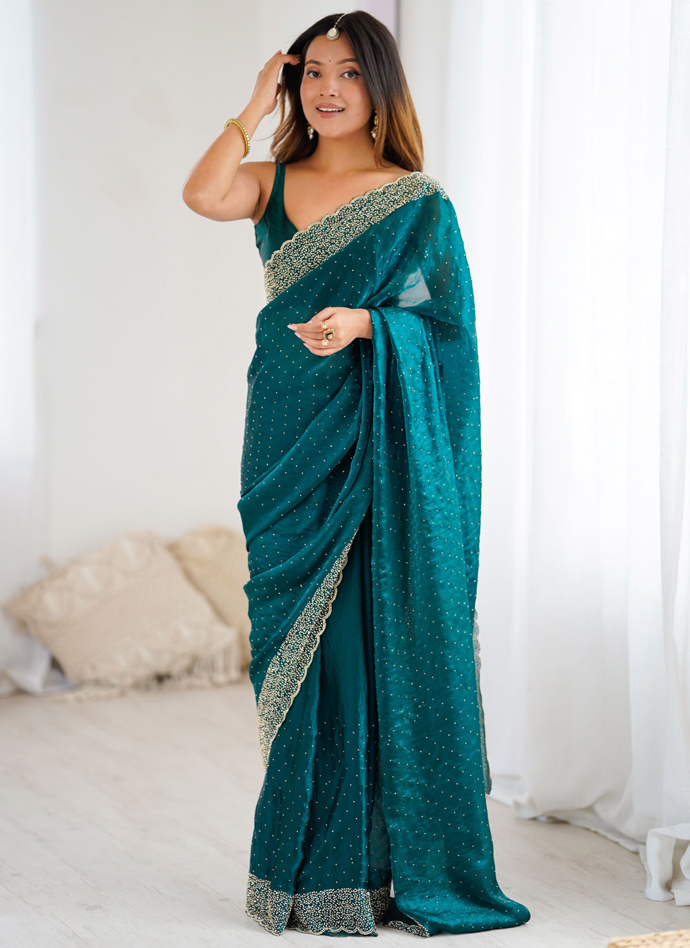 This designer black satin saree is an elegant blend of smooth texture and artistic embellishment. The carefully placed Zarkan work adds a shimmering depth that beautifully complements the rich black tone. Comes with matching blouse.