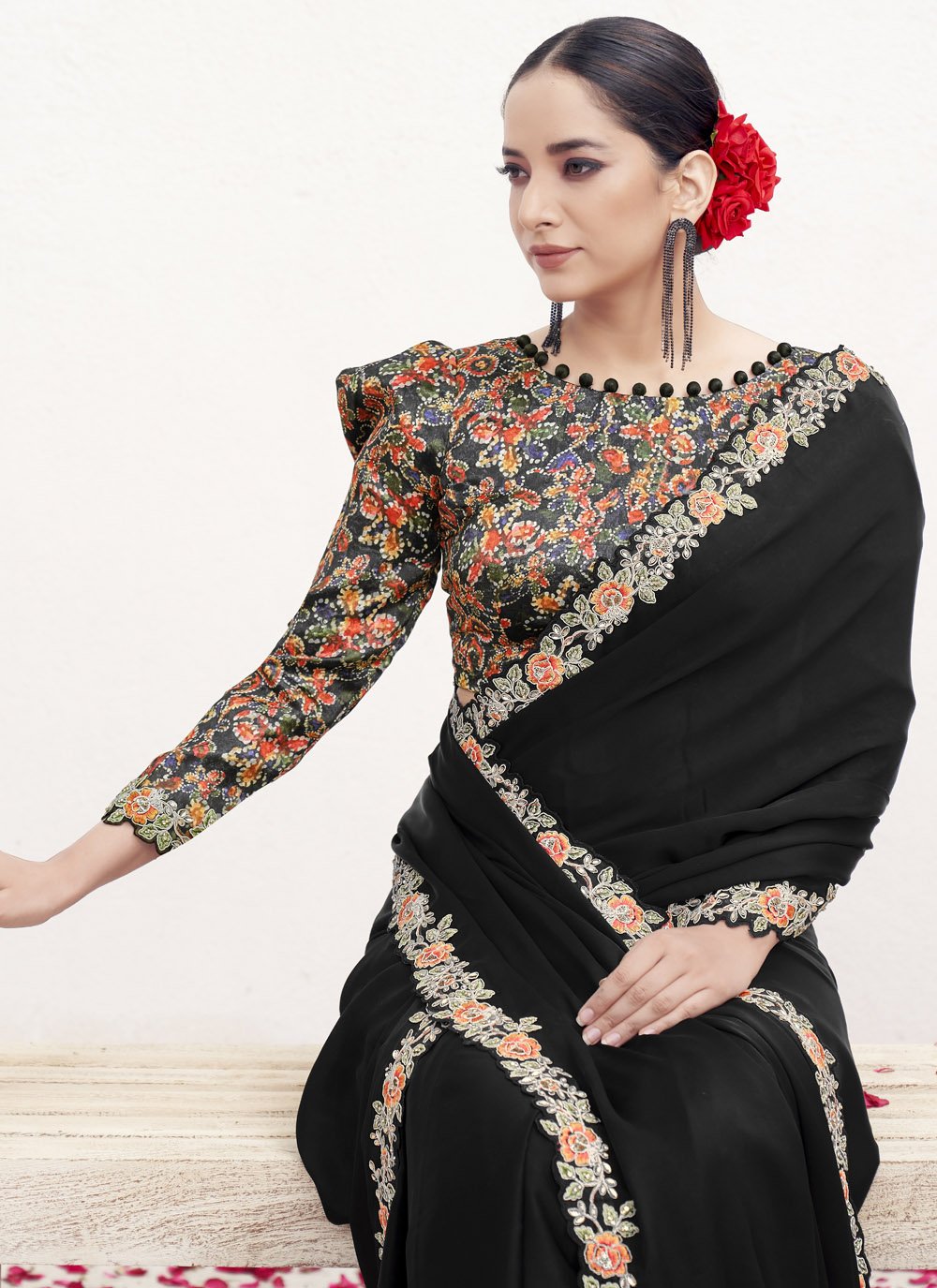 Step into timeless glamour with this Black Satin Silk Saree, beautifully adorned with intricate zari embroidery and sparkling sequins. Wear it for weddings, Diwali parties, or formal gatherings and let your look speak volumes. Comes with matching blouse.