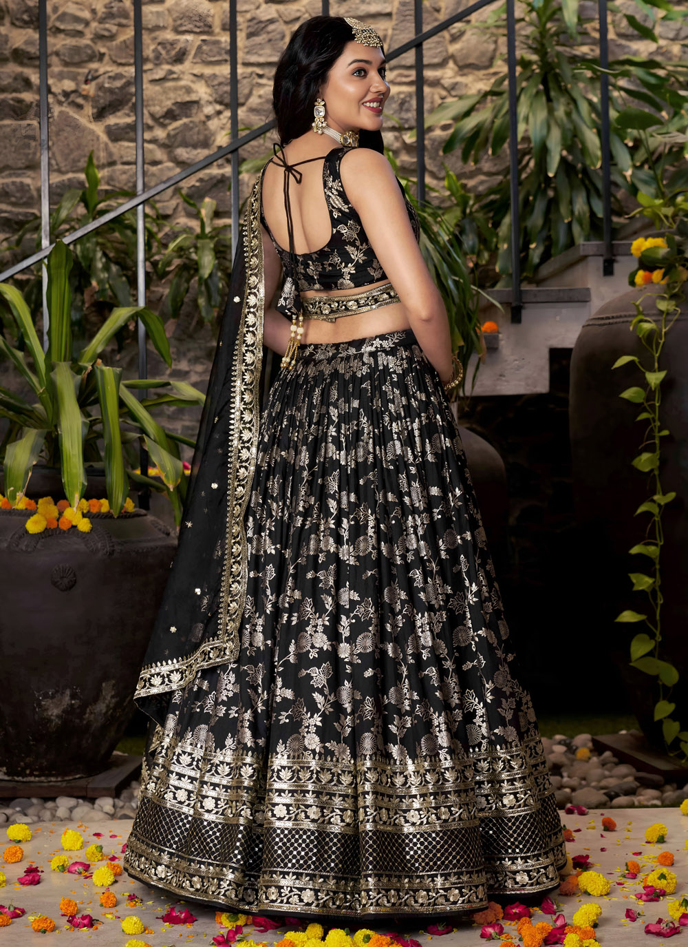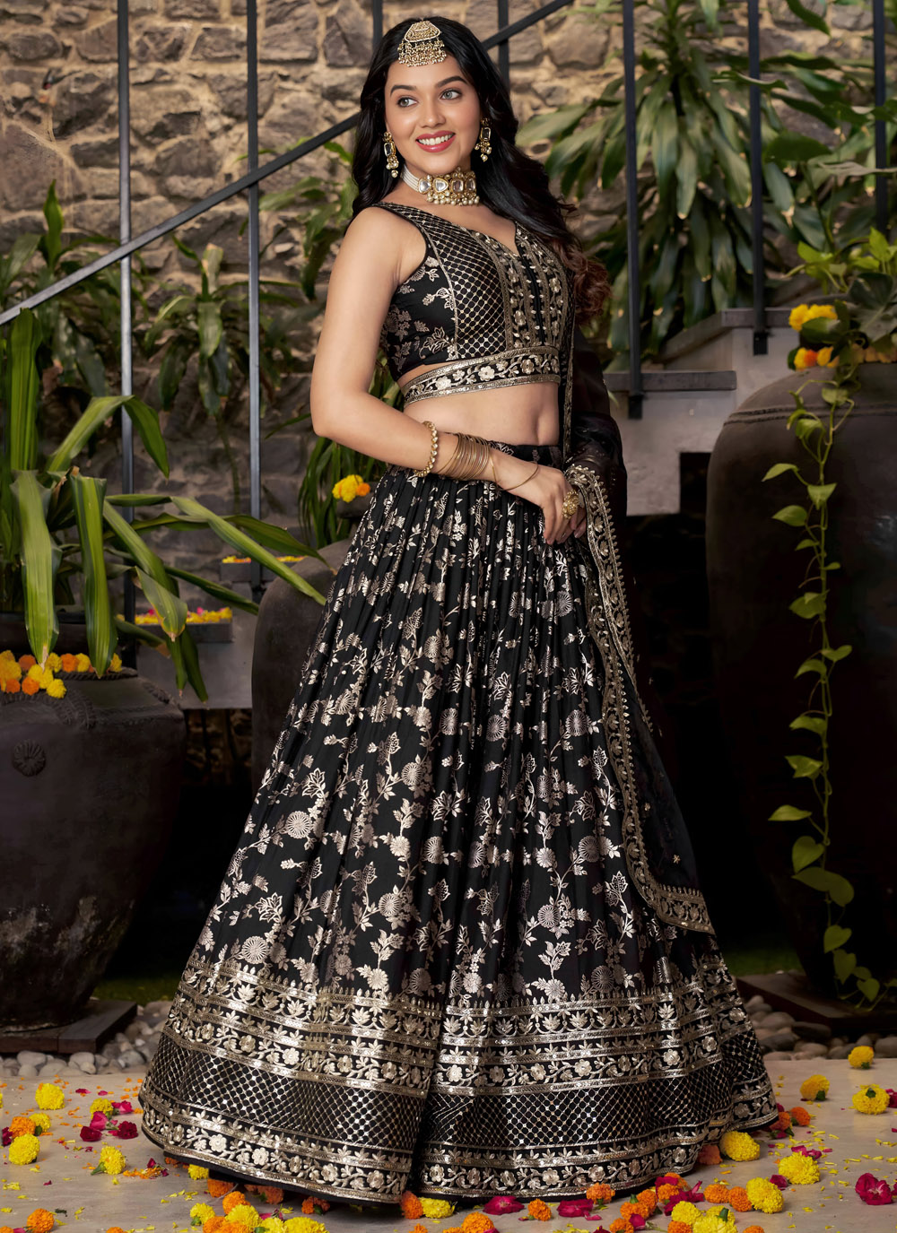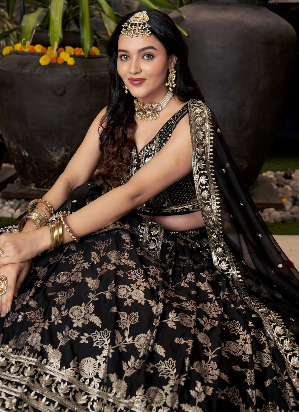 This stunning black dola jacquard lehenga choli is adorned with shimmering sequins and intricate zari embroidery that create an opulent look. The rich jacquard weave adds texture and depth, making it a perfect choice for receptions, sangeet nights and grand festive occasions. Comes with matching choli and dupatta.