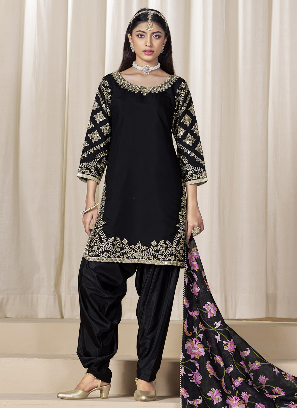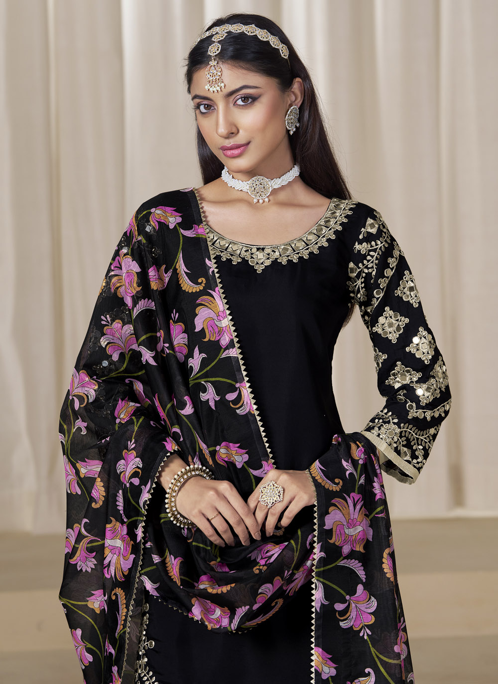 Crafted in rich black silk, this salwar suit showcases intricate zari patterns and carefully placed mirror embellishments along the neckline and borders. It offers a perfect balance of traditional detailing and sophisticated appeal, ideal for weddings, receptions and special occasions. Comes with matching bottom and dupatta.