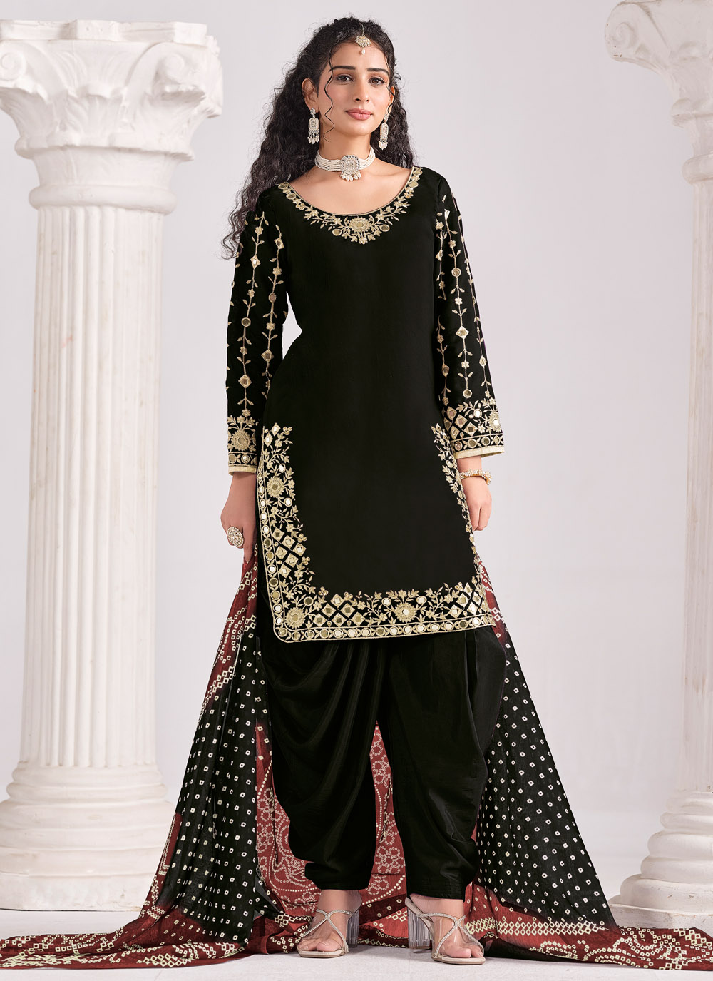 Elevate your style with this black silk salwar suit featuring mirror and zari embroidery. A chic designer outfit that blends traditional artistry with modern elegance. Comes with matching bottom and dupatta.