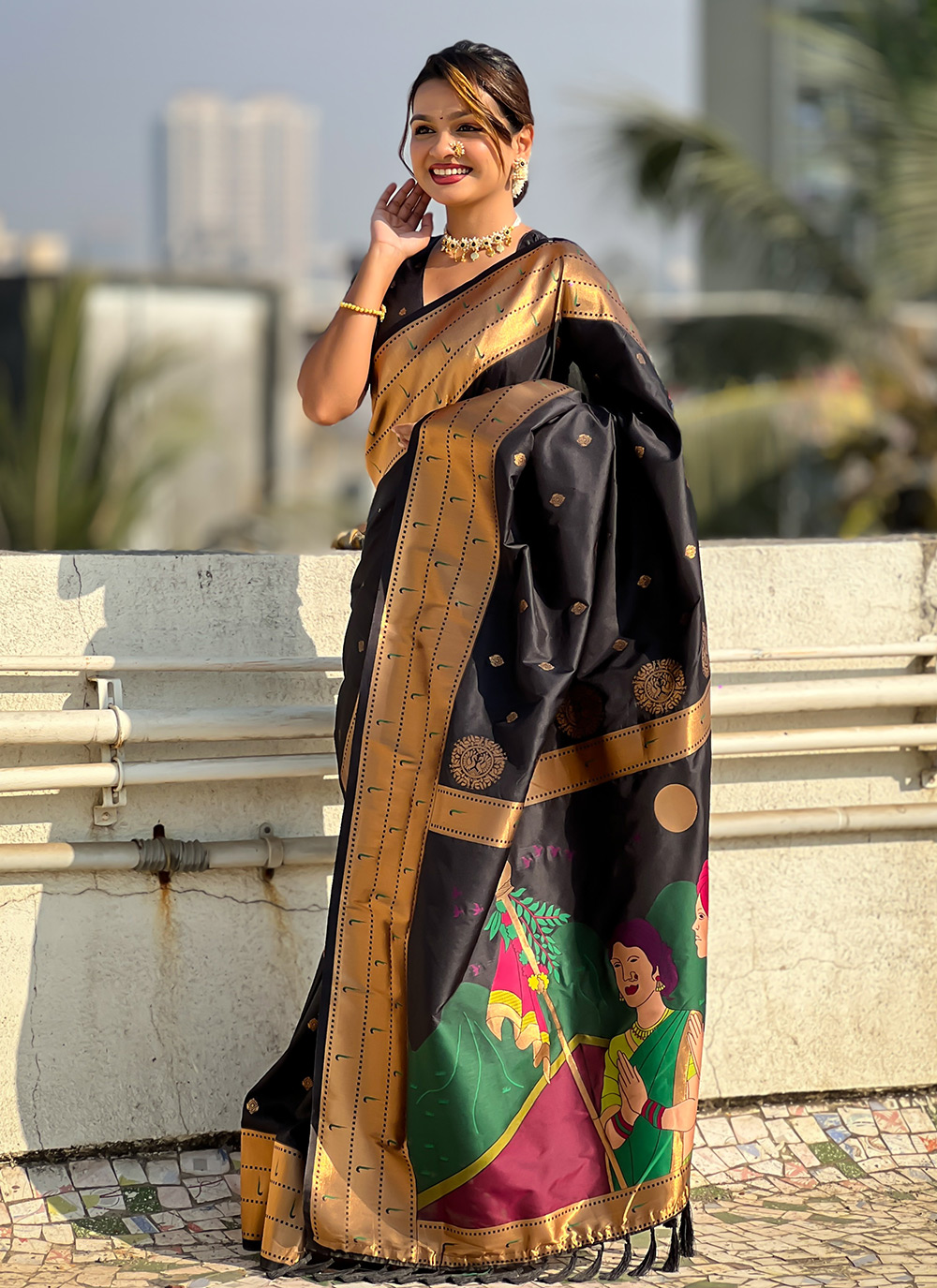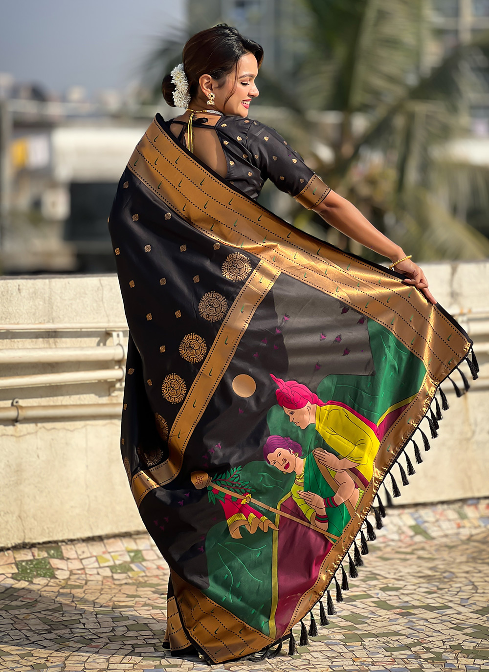 This Black Silk Weaving Saree, with a matching blouse, combines luxury and style. The rich black fabric is beautifully woven, making it perfect for parties and special occasions. Elegant, comfortable, and timeless.