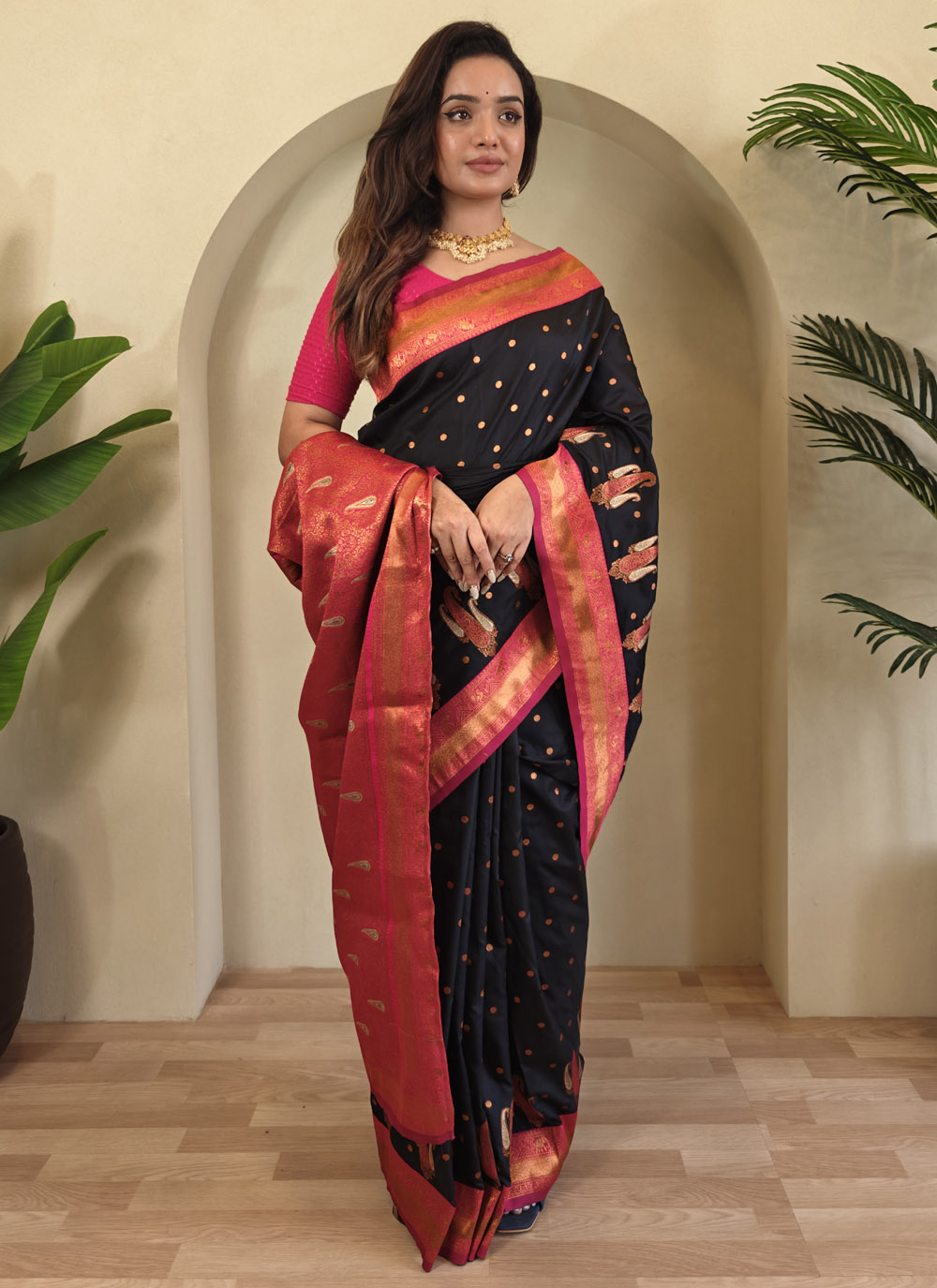 This Black Silk Saree combines contemporary design with traditional weaving techniques. The intricate weaving work enhances the sleek, sophisticated black fabric. Perfect for celebrations, weddings, or receptions, this saree offers timeless appeal with a contemporary twist. Comes with matching blouse.