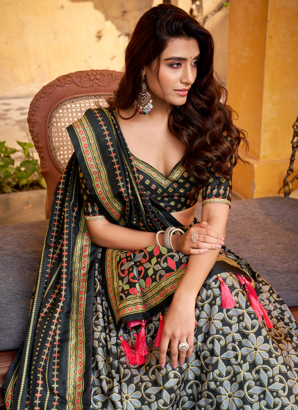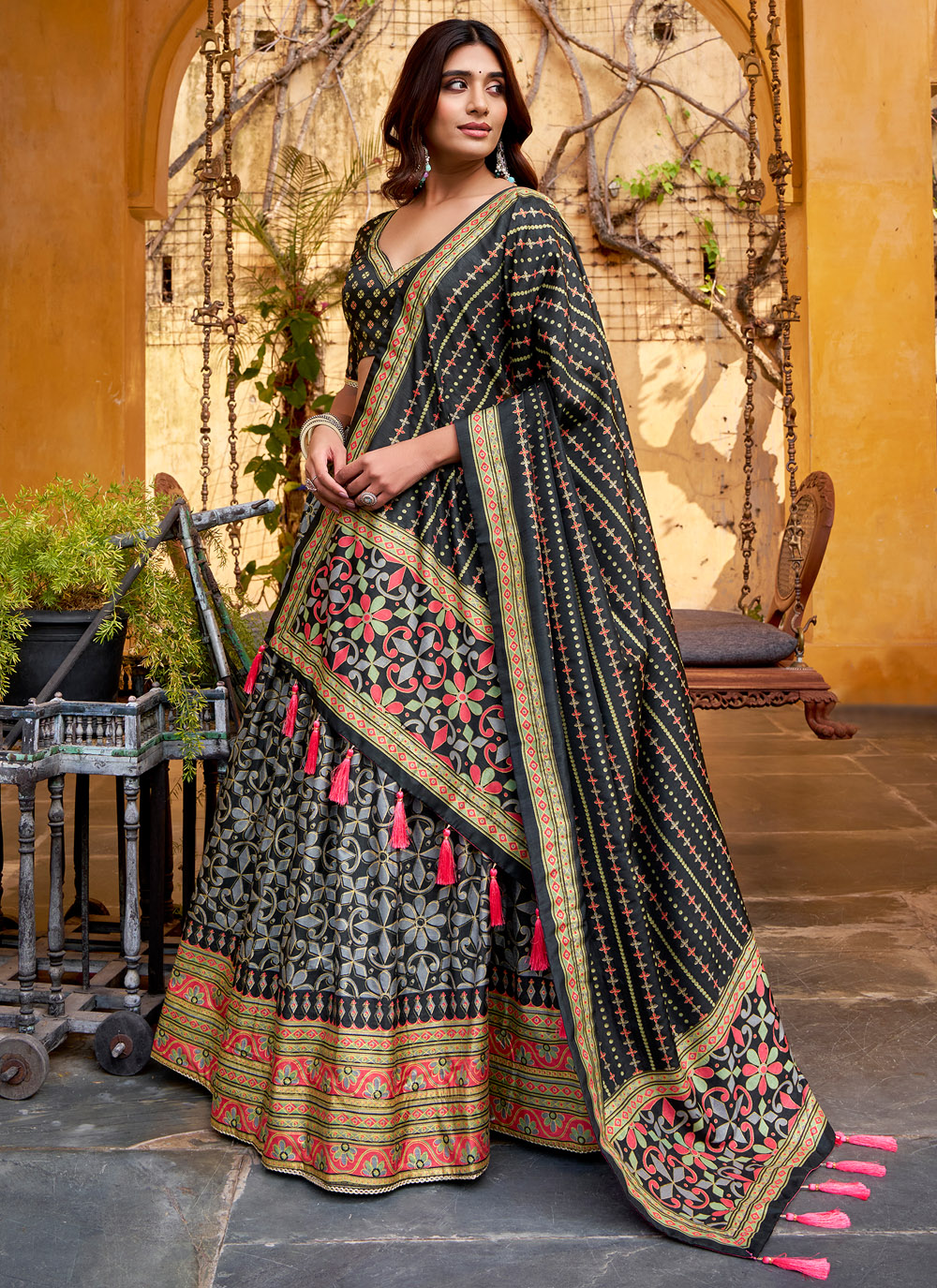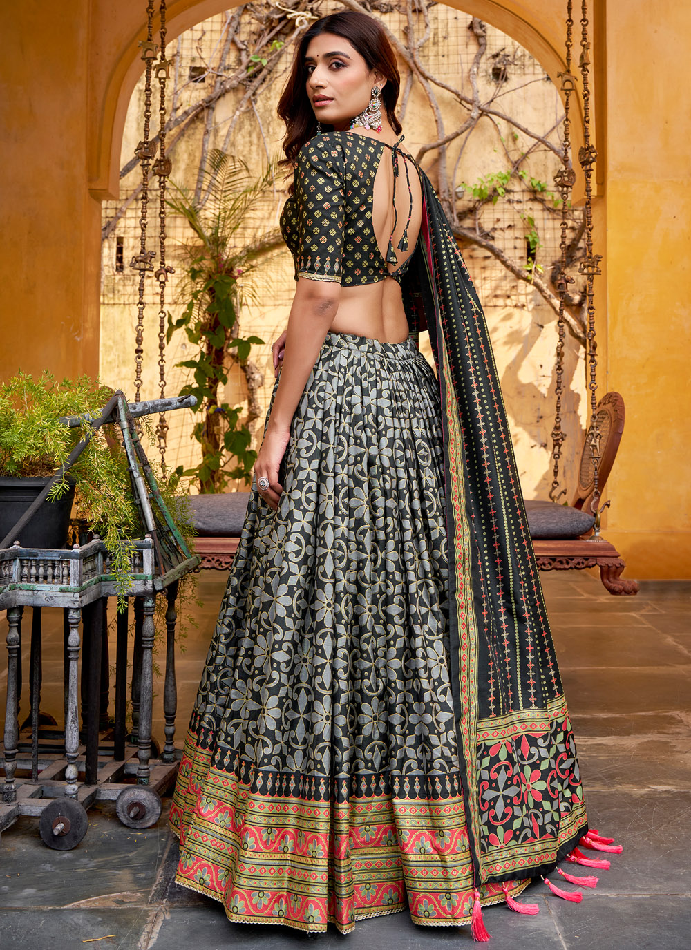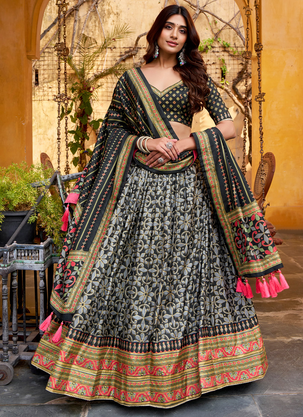 This trendy black lehenga choli blends the richness of Tussar silk with eye-catching printed designs. Crafted for movement and style, it is perfect for sangeet functions, festive parties, and evening celebrations. Comes with matching choli and dupatta.