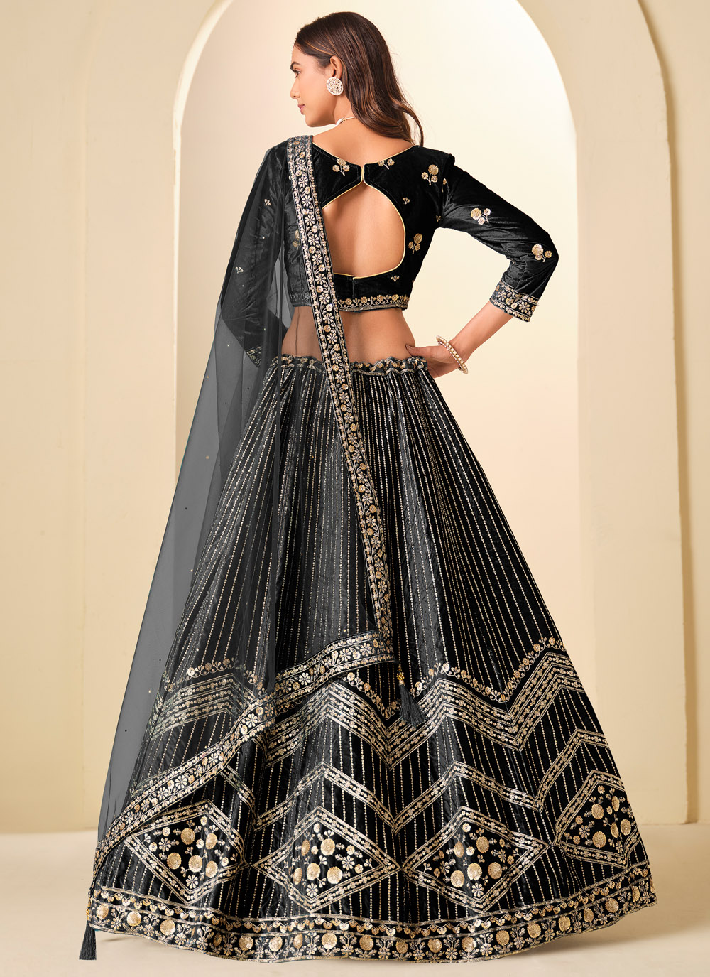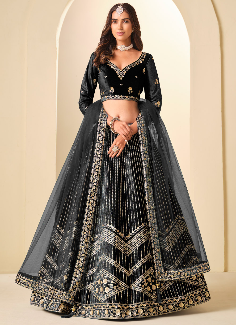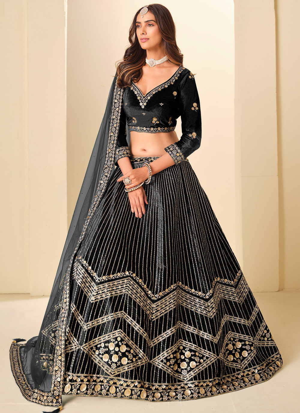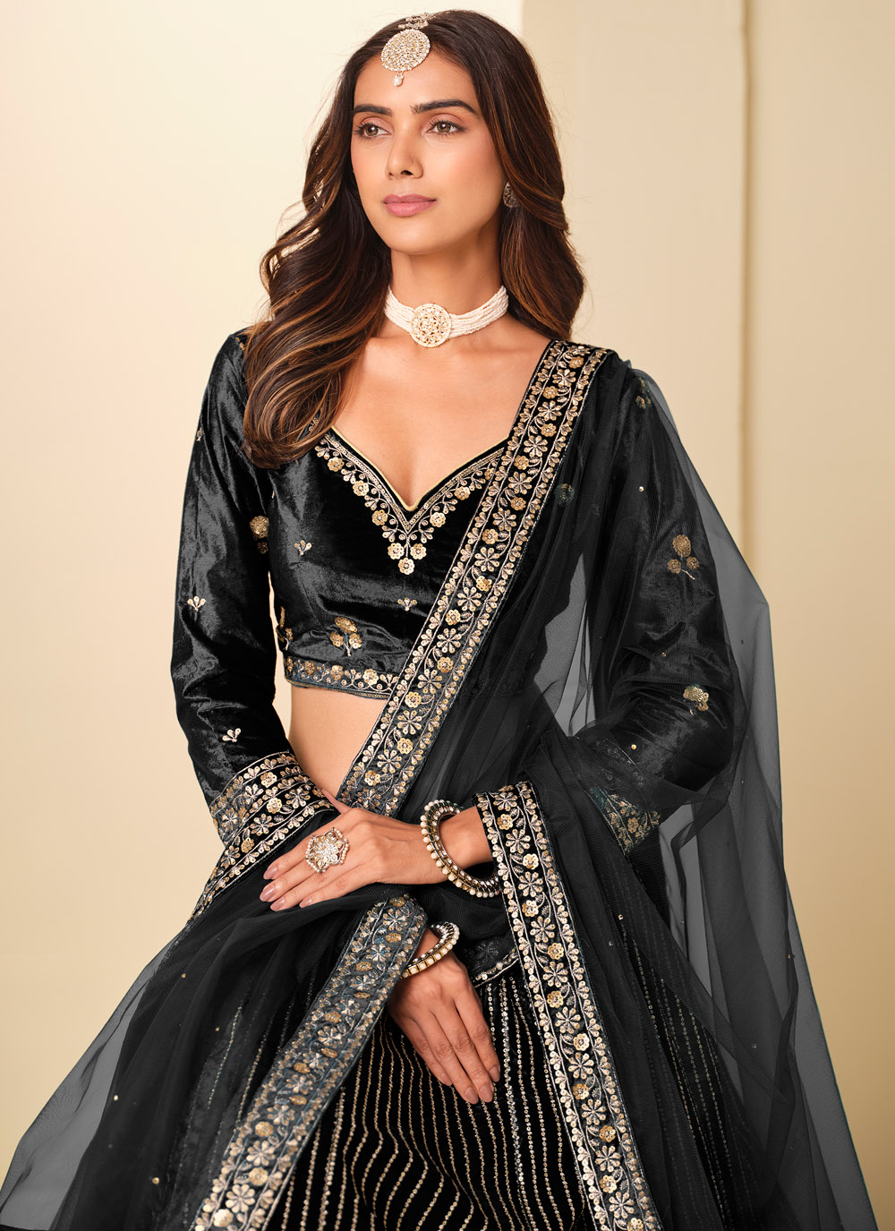 This sequins embroidered black velvet lehenga choli blends bold colour with refined craftsmanship. The smooth velvet base enhances the intricate work, making it ideal for receptions, sangeet and special occasions. Comes with matching choli and dupatta.