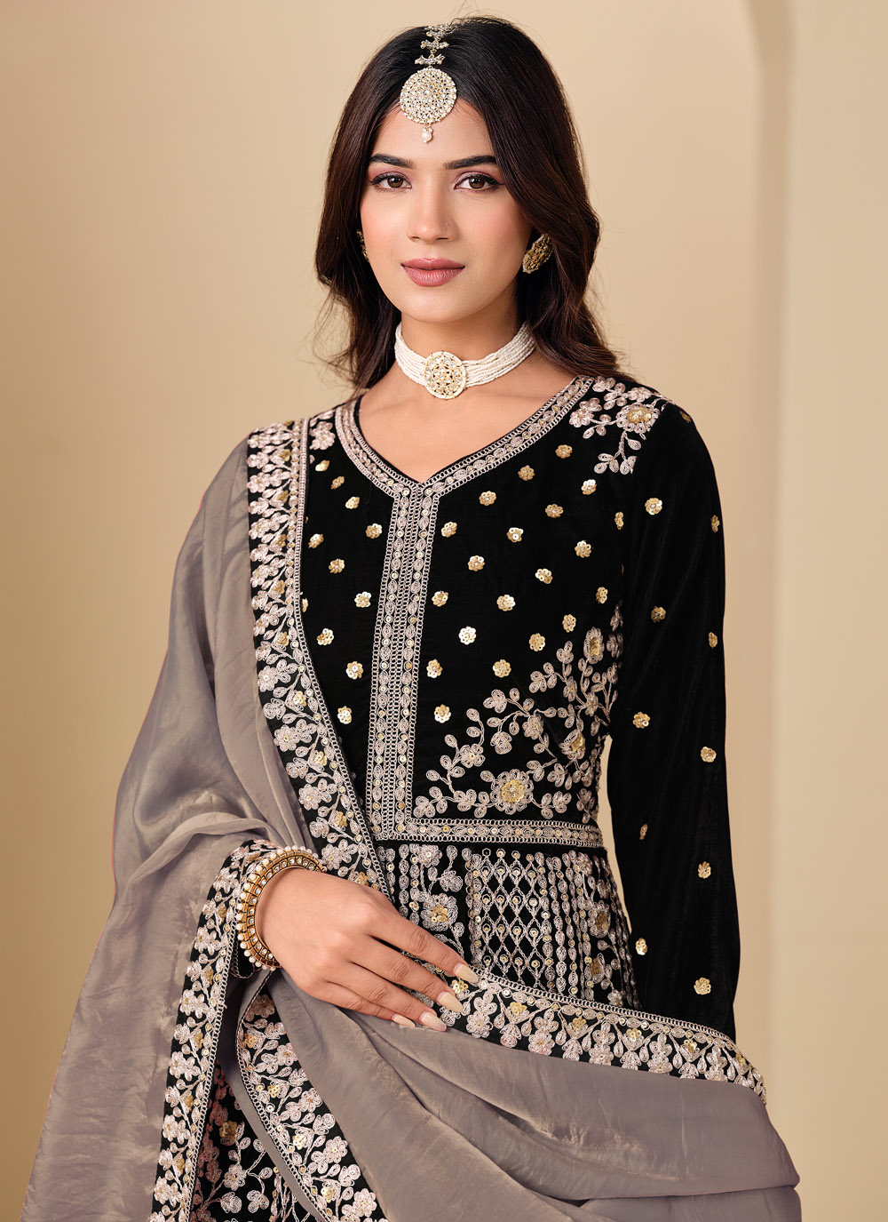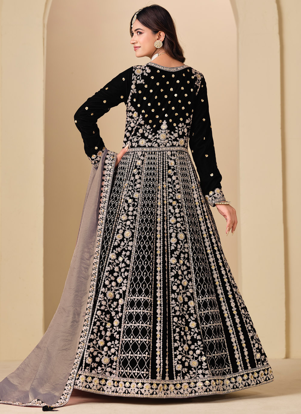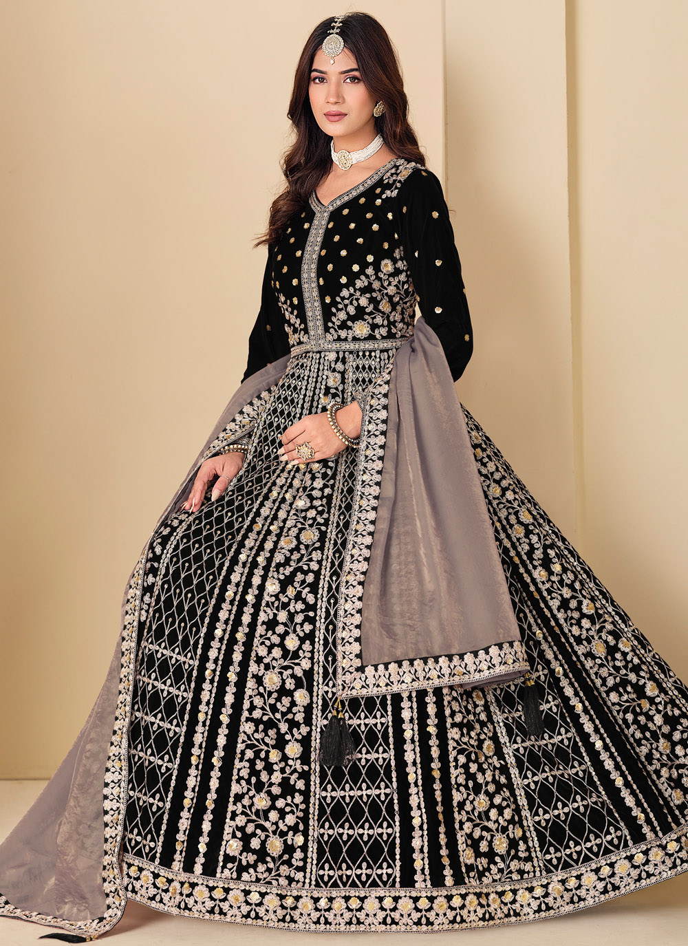 This black Anarkali salwar suit is crafted in luxurious velvet and enhanced with sequins and resham embroidery. The rich fabric and graceful flare create a royal look, perfect for weddings and evening functions. Comes with matching bottom and dupatta.