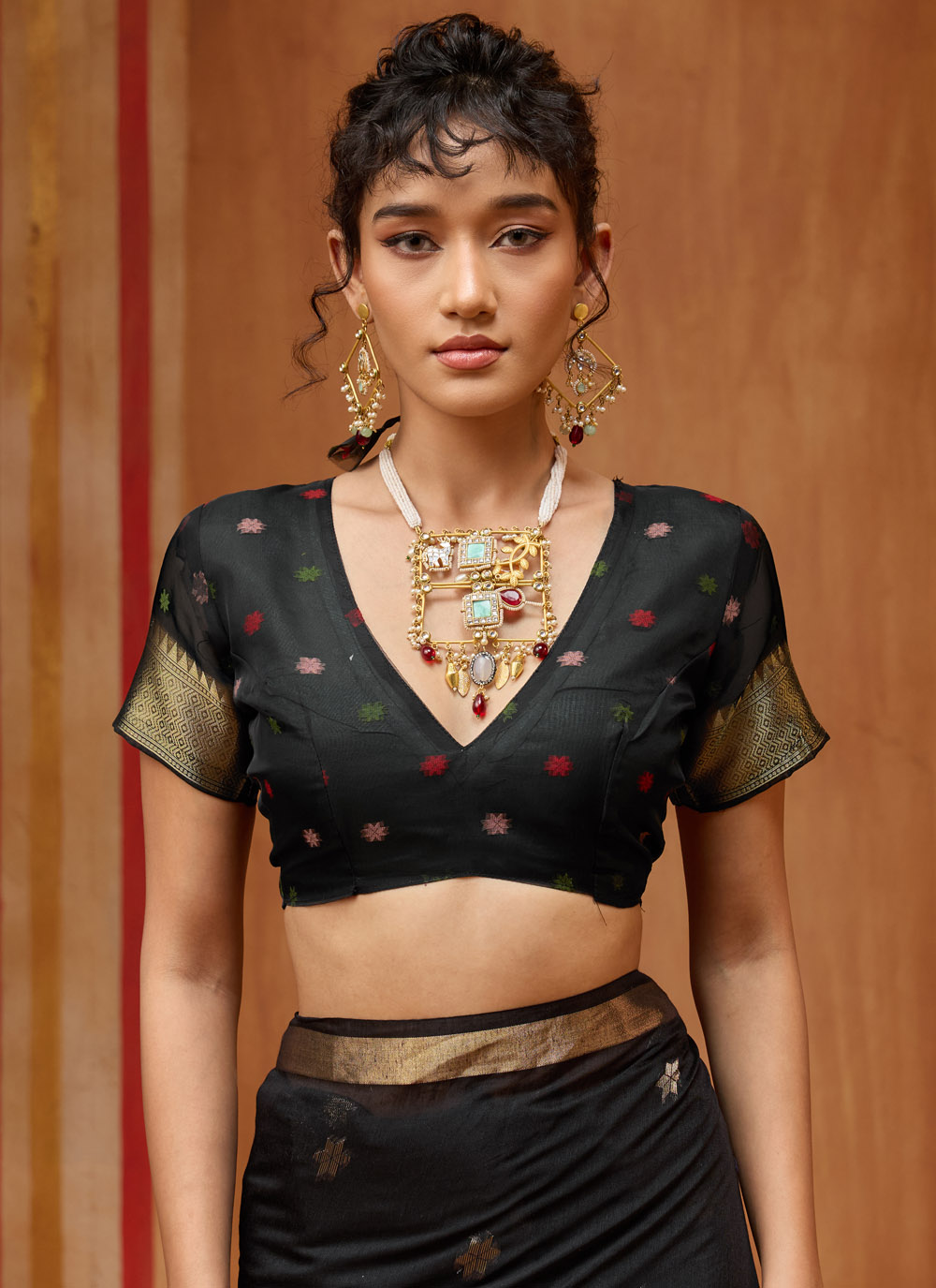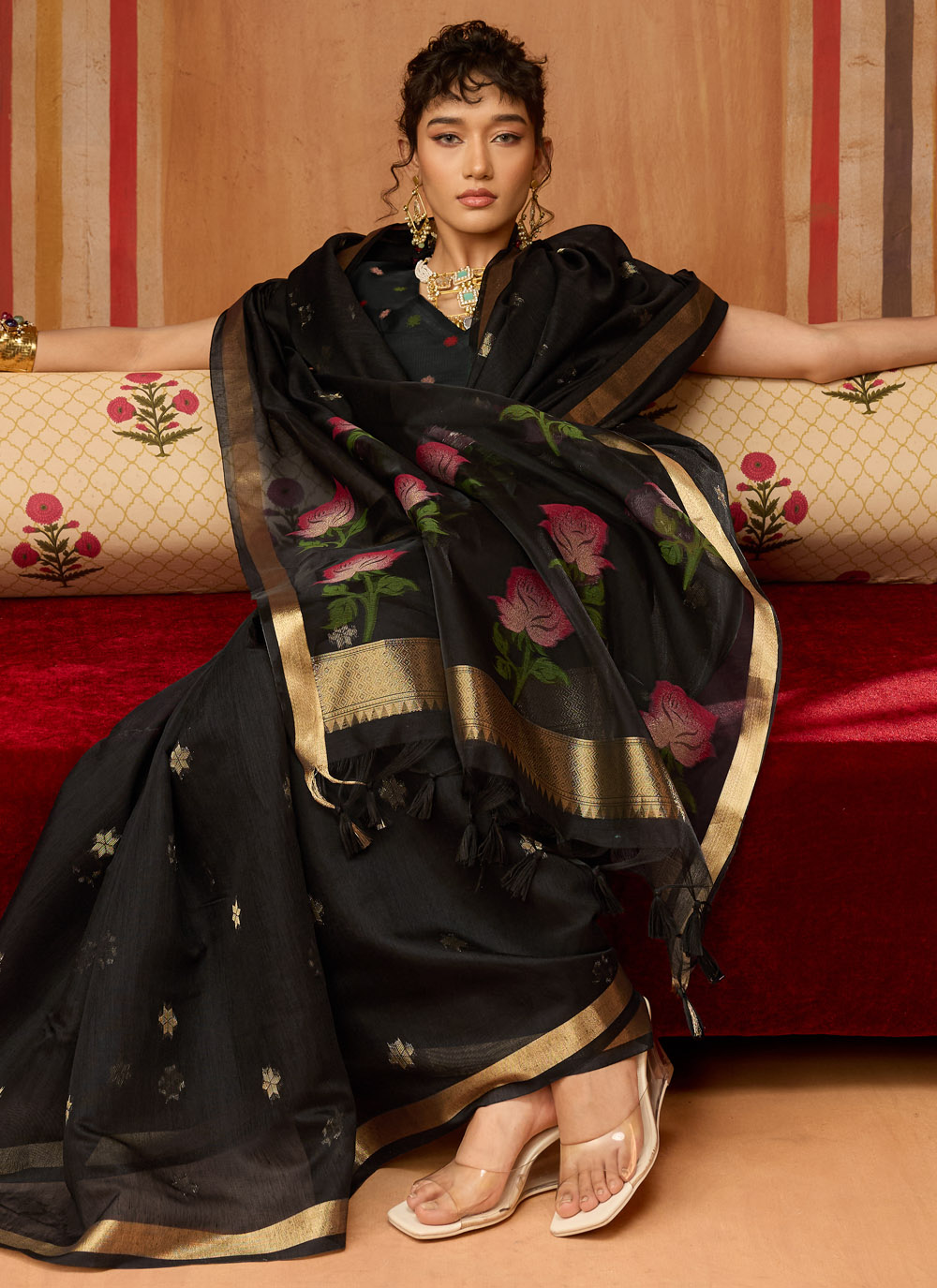 Crafted with traditional handloom techniques, this Black cotton saree features intricate weaving work that reflects skilled craftsmanship. The lightweight fabric allows easy movement and graceful draping. Comes with matching blouse.