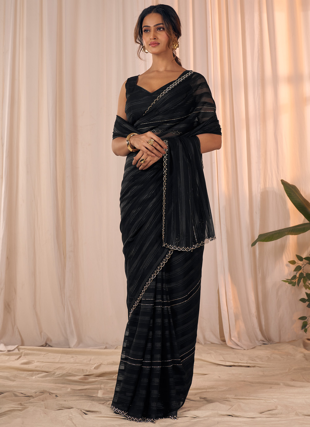 This black georgette saree is designed for party nights where elegance matters. The shimmering zarkan border paired with fine cut work adds a refined sparkle, giving you a glamorous yet balanced look. Comes with matching blouse.