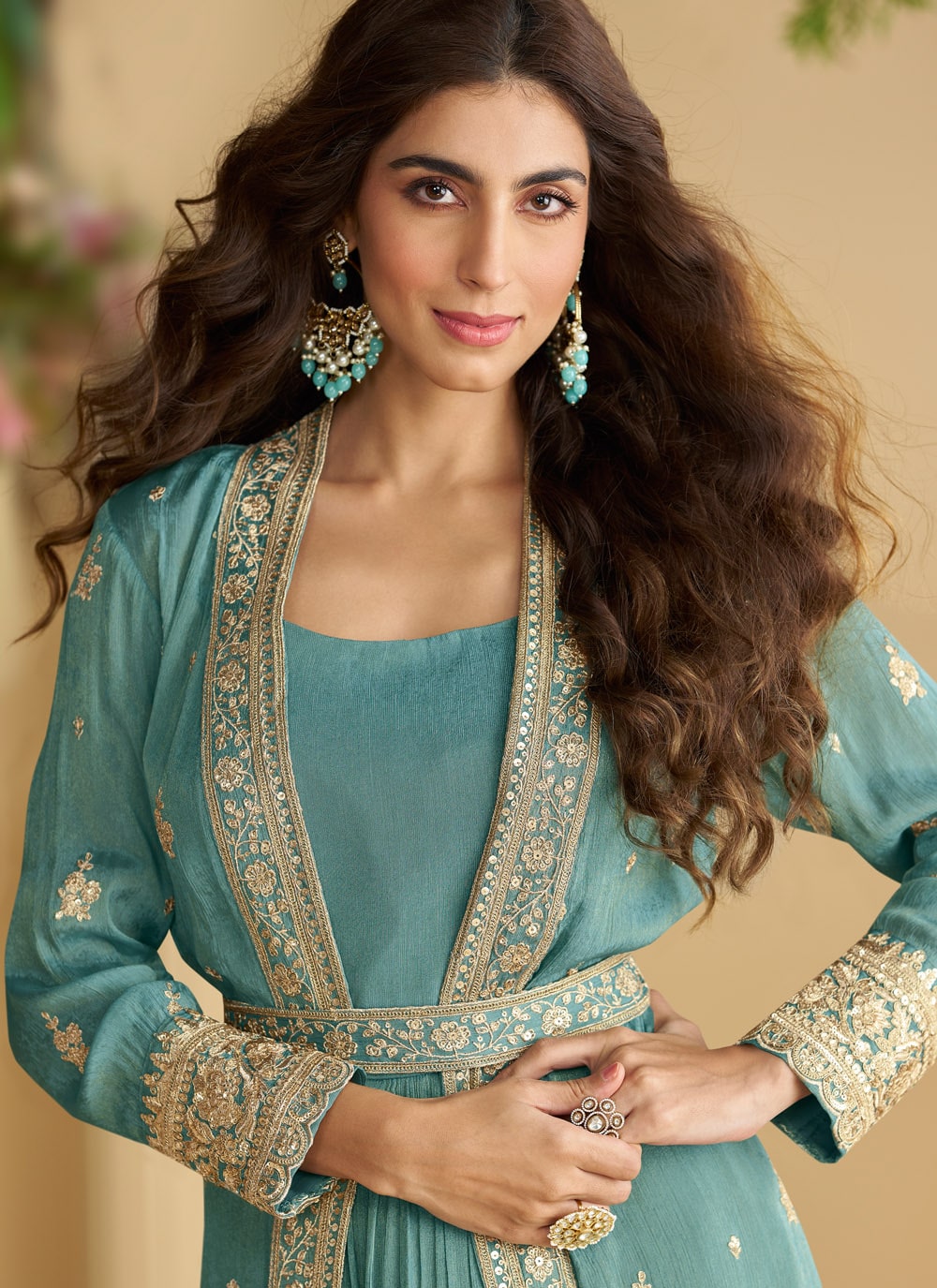 This green designer wedding gown in Chinon silk exudes elegance with elaborate sequins and zari embellishments, ideal for bridal functions and ceremonial events.