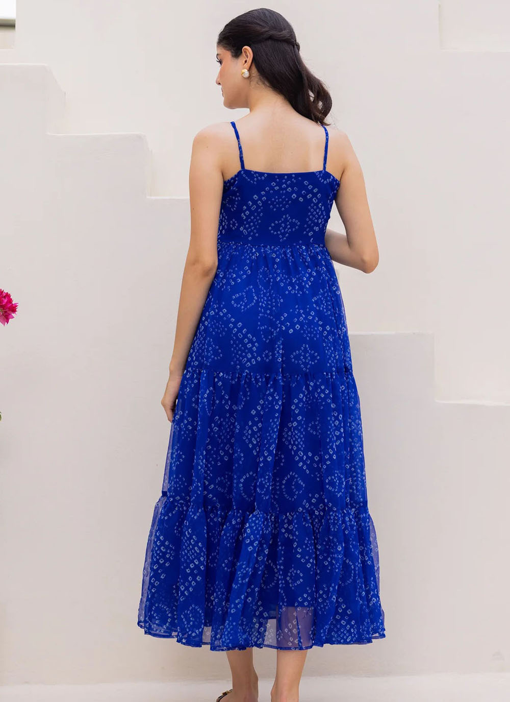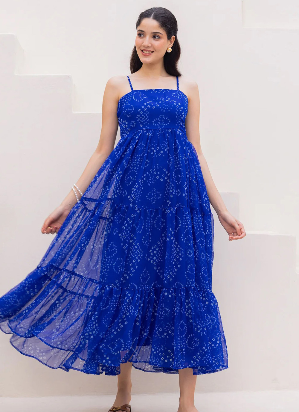 This blue georgette gown showcases a modern charm with its smooth drape and eye-catching digital prints. The lightweight fabric moves gracefully, making it comfortable for long celebrations. The trendy silhouette adds a contemporary touch.