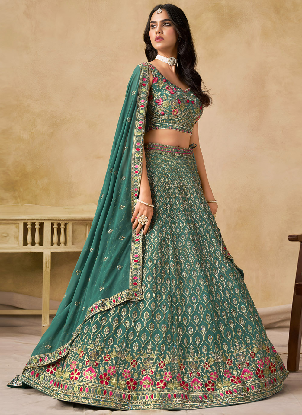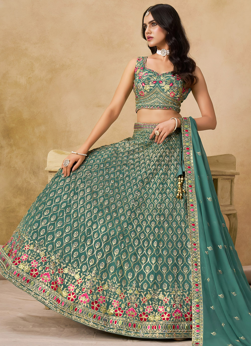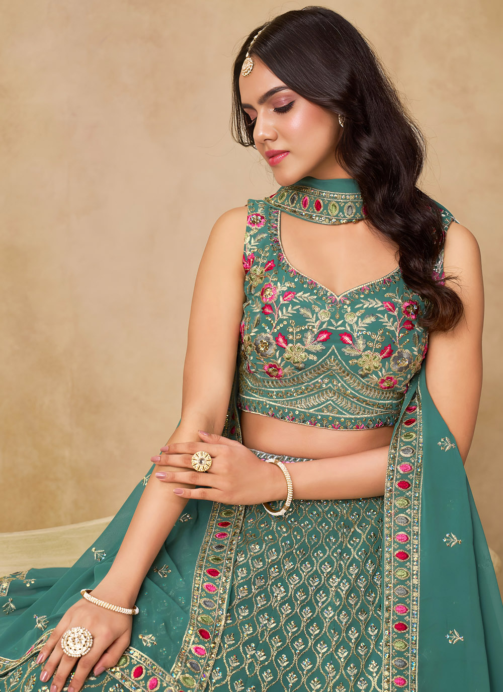This blue georgette lehenga choli brings together graceful flair and modern festive glamour. The soft georgette fabric drapes beautifully, while intricate sequins and delicate thread embroidery add a luminous touch. Designed for celebrations, sangeet and receptions. Comes with matching choli and dupatta.
