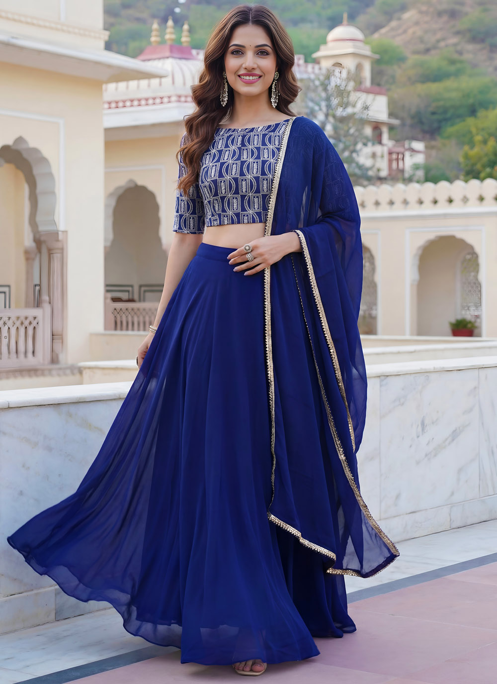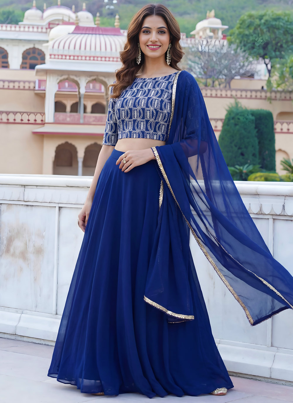 This Blue lehenga choli blends elegance and glamour through its fine georgette fabric and detailed embroidery. The combination of thread, zari, and sequins work gives a rich traditional finish. Comes with matching choli and dupatta.