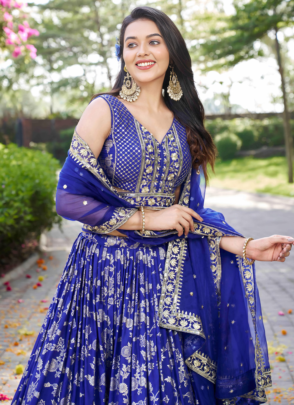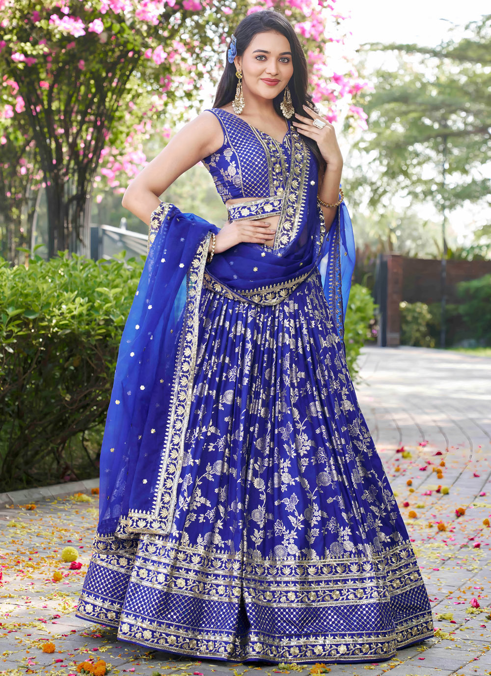 Step into timeless elegance with this blue Dola jacquard lehenga choli, showcasing exquisite zari embroidery and sequins that add a hint of sparkle. The flowing skirt and classic blouse make it a standout ensemble for cultural gatherings, festive functions or party wear. Comes with matching choli and dupatta.