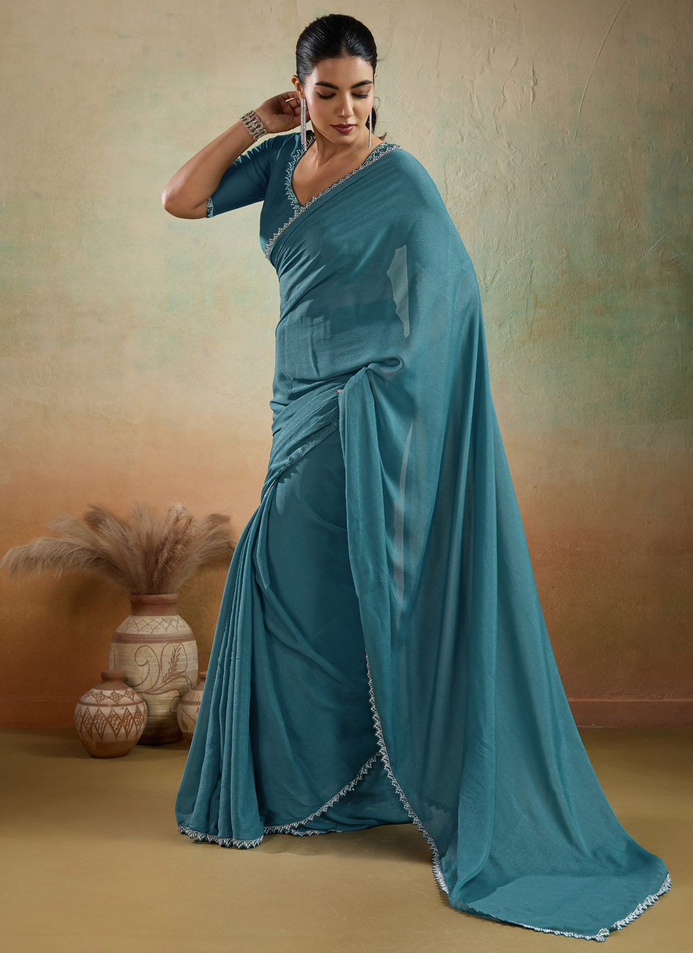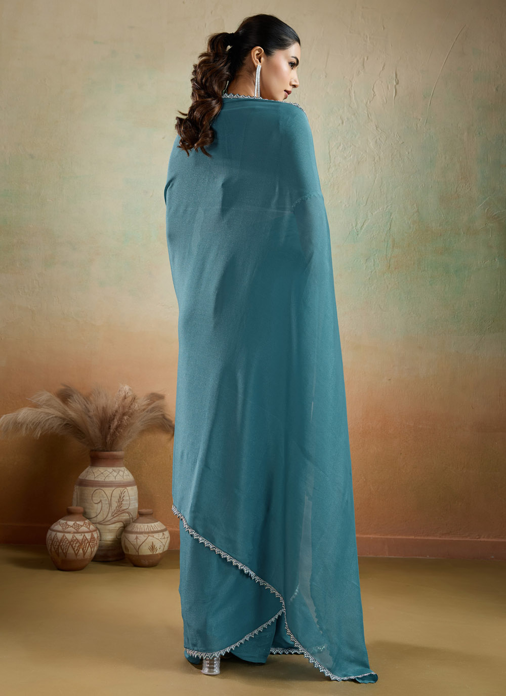 Step into relaxed elegance with this blue lace border work saree in soft georgette. Simple yet stylish, it’s a graceful choice for women who prefer minimal beauty with a contemporary twist. Comes with matching blouse.