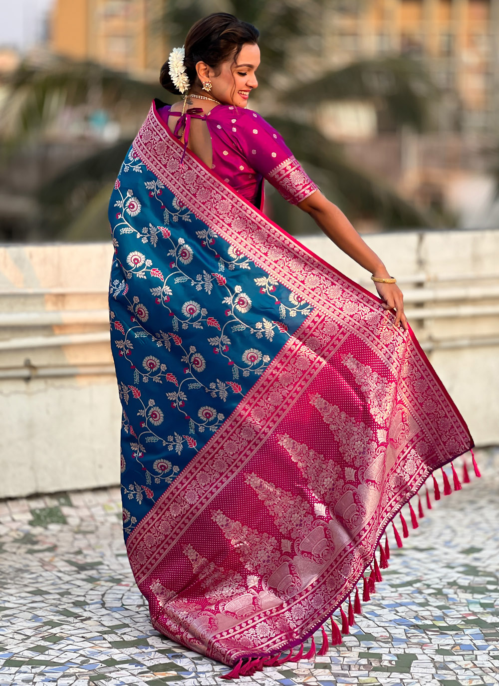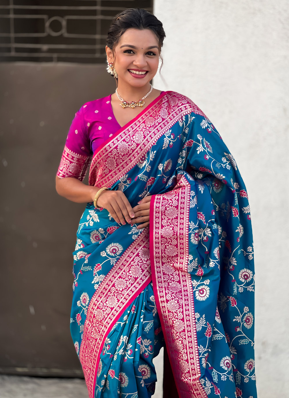 Drape yourself in luxury with this exquisite Blue Banarasi Silk Saree. Its intricate Meenakari weaving and rich texture make it the perfect attire for grand occasions, ensuring a regal and graceful appearance. Comes with matching blouse.