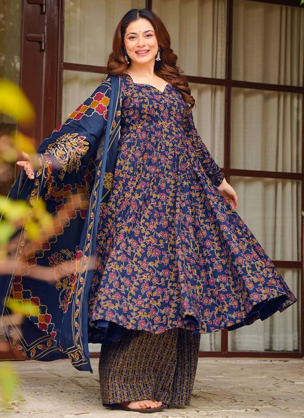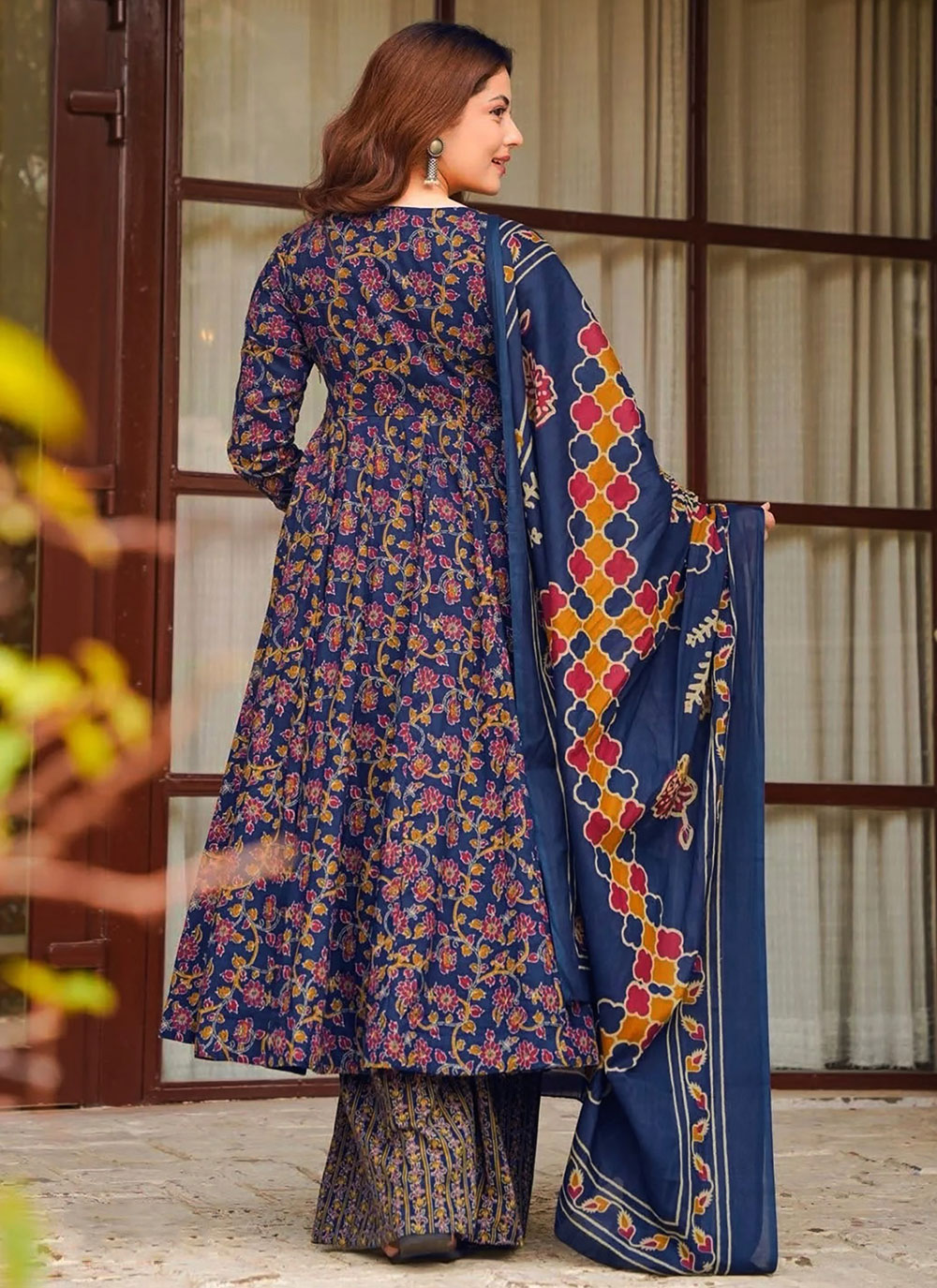 Experience stylish comfort with the Blue Muslin Digital Printed Readymade Palazzo Salwar Suit. The soothing blue shade combined with attractive digital prints gives a fresh ethnic vibe. Comes with matching bottom and dupatta.