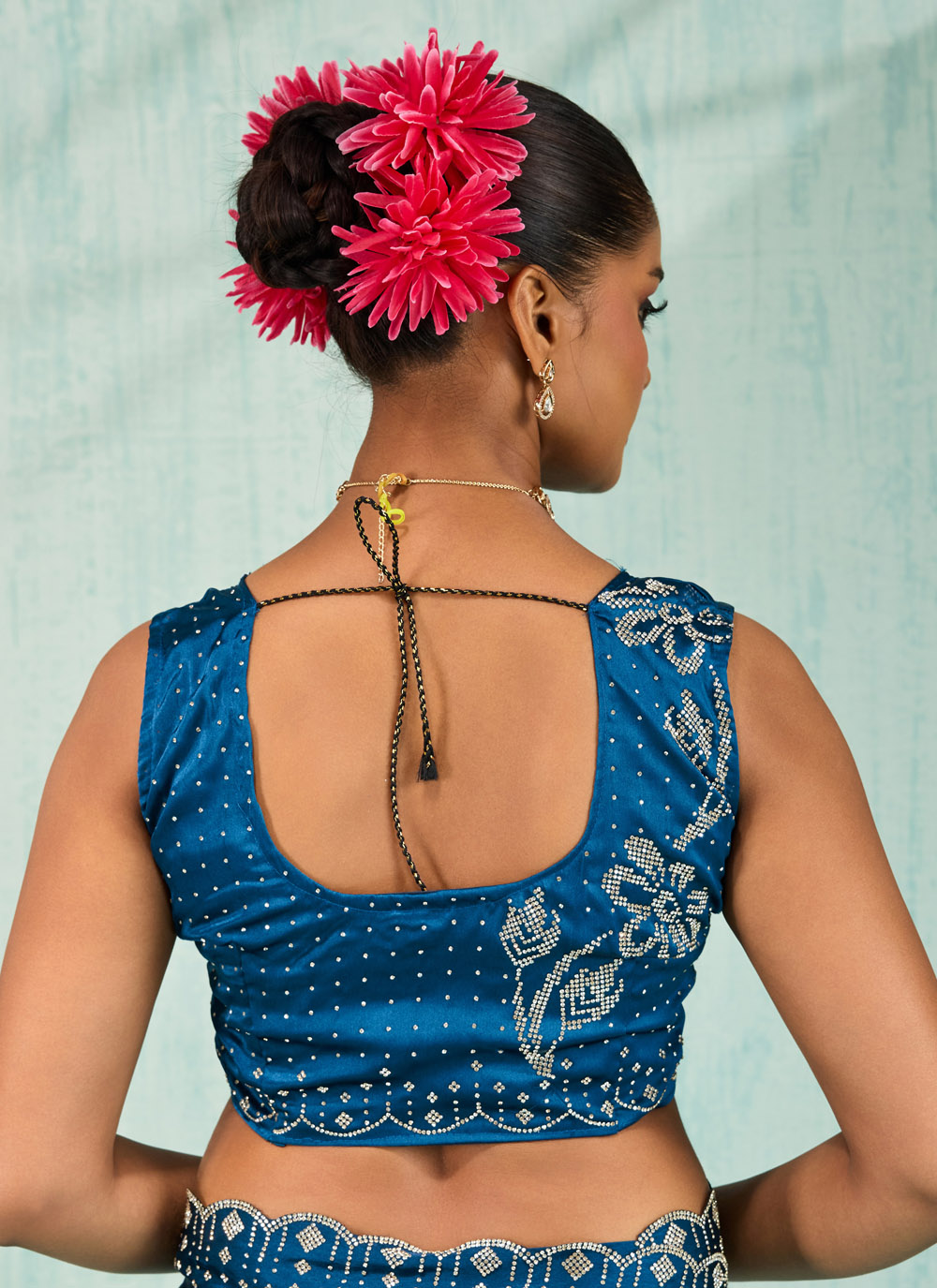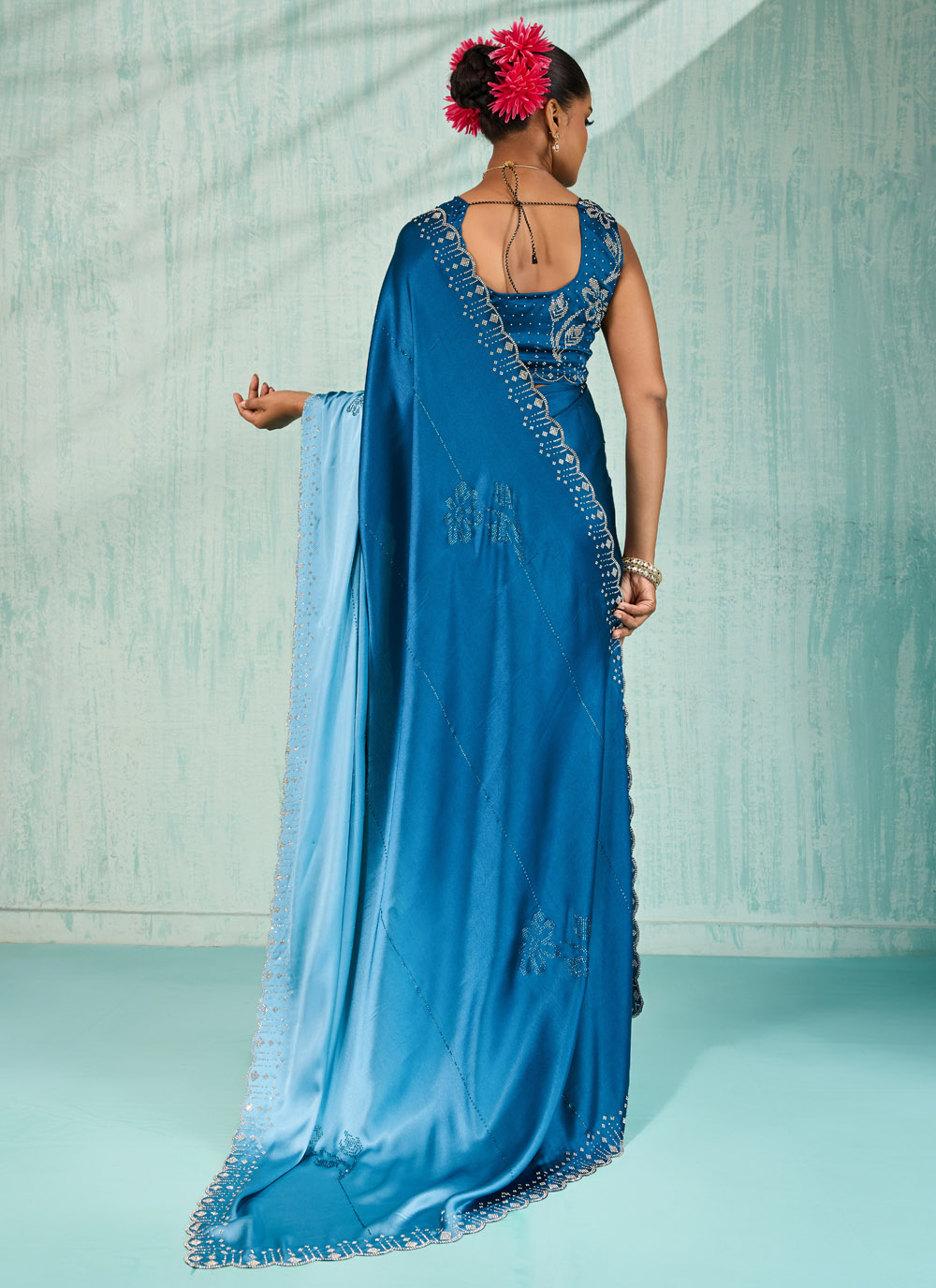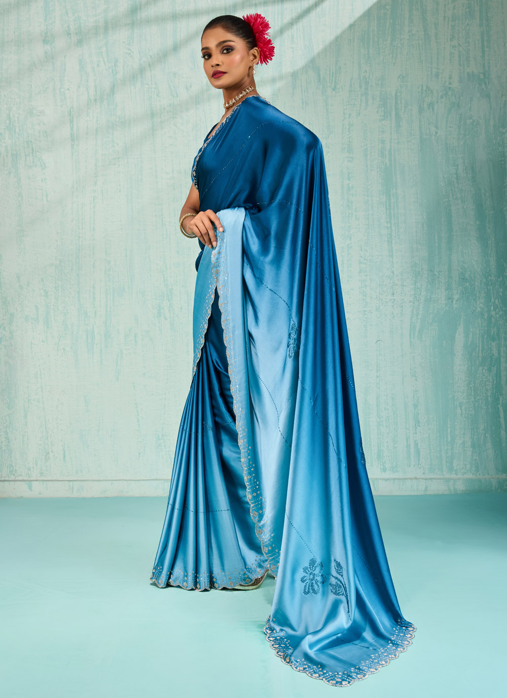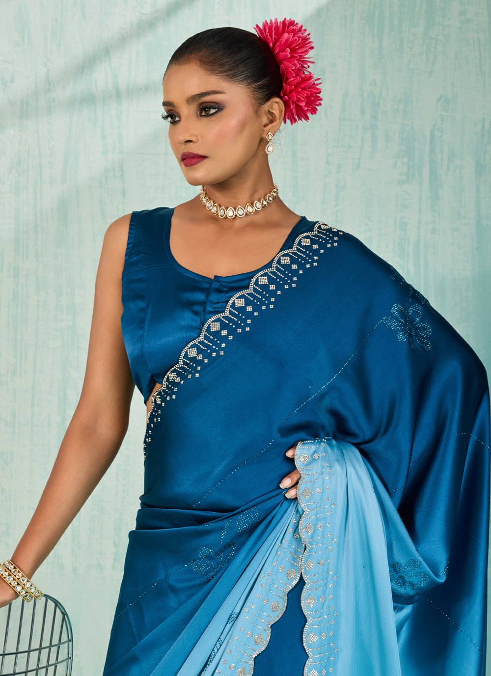 Make a statement of regal elegance with this Blue Satin Saree, intricately adorned with shimmering Swarovski embellishments and exquisite cutwork detailing. The rich satin fabric drapes gracefully, highlighting every contour while adding a luxurious sheen. Perfect for weddings, receptions or grand festivities. Comes with matching blouse.