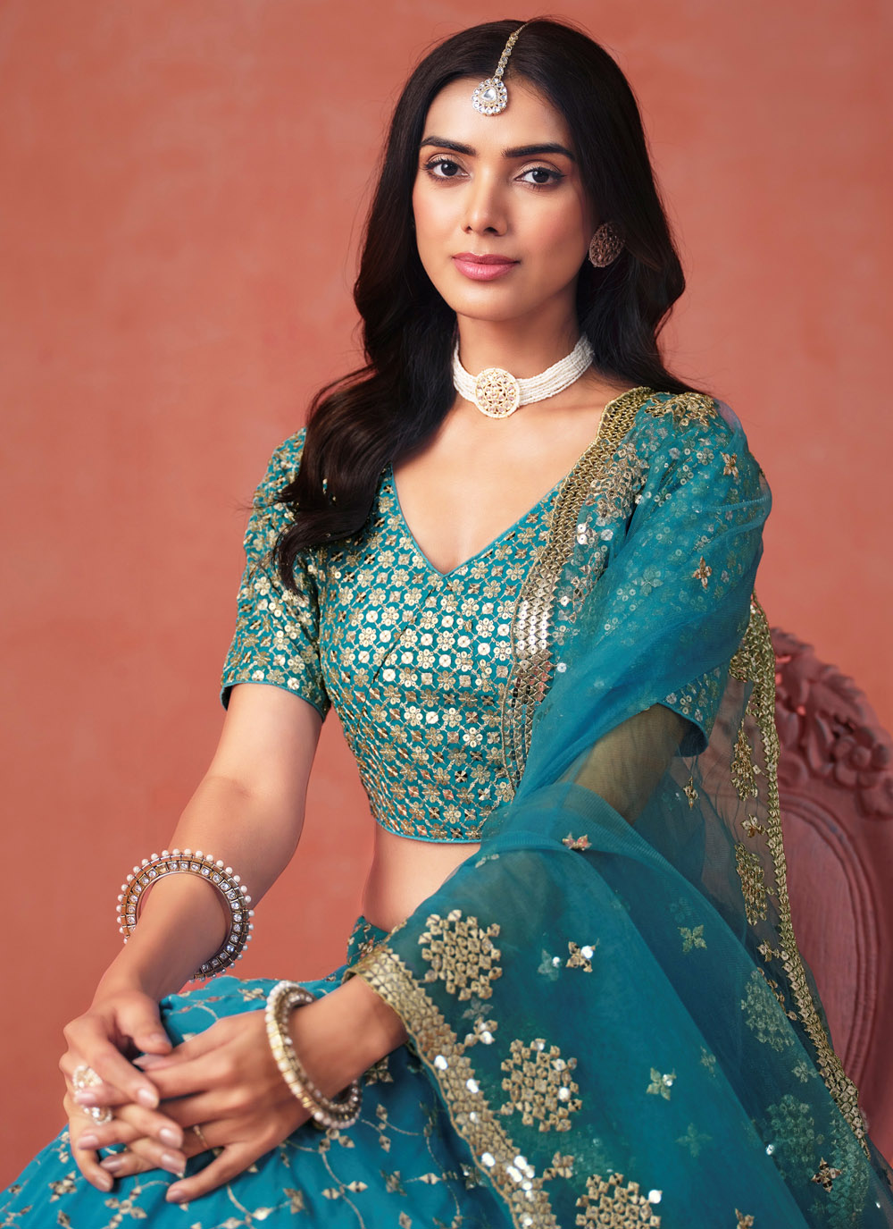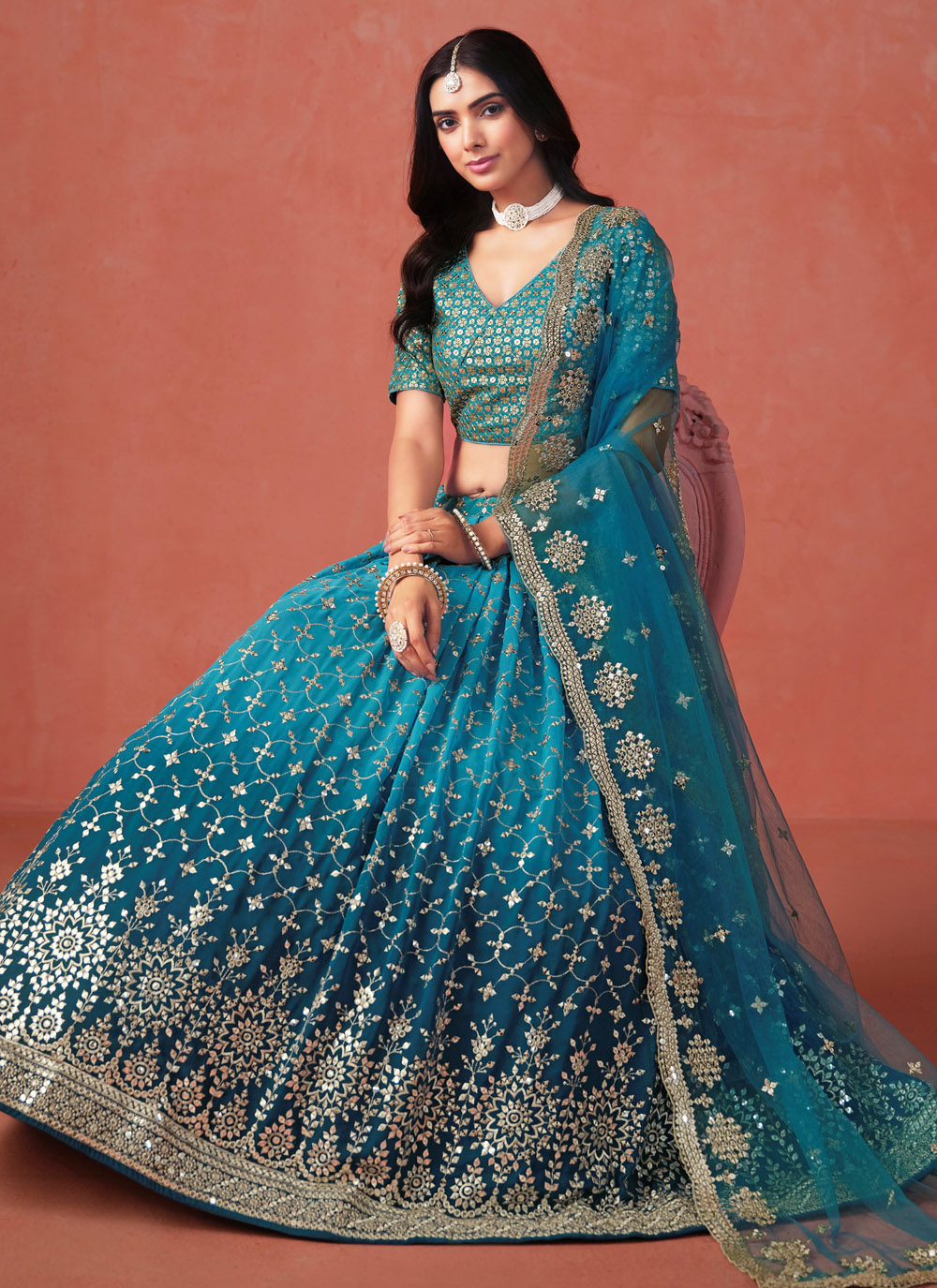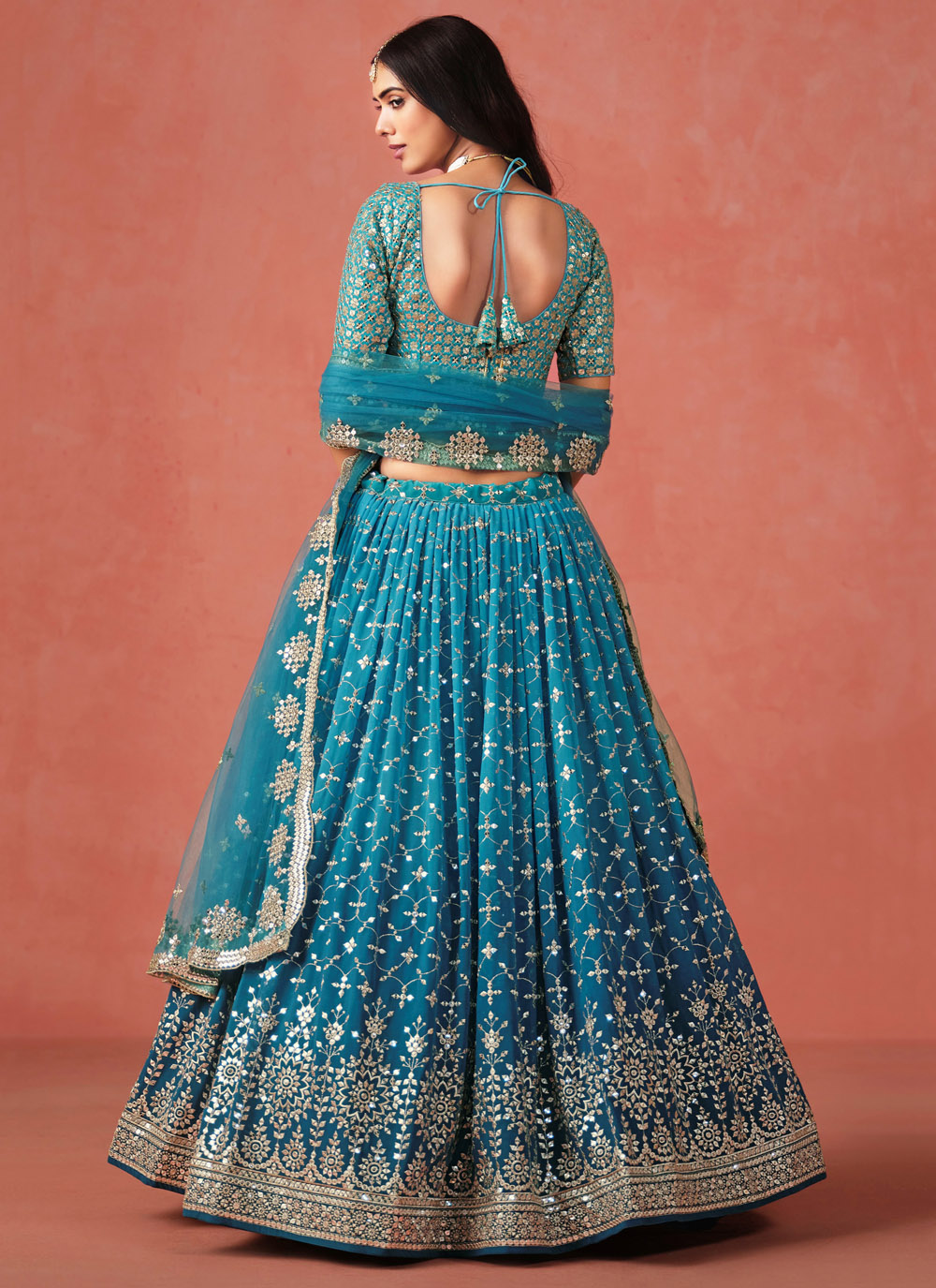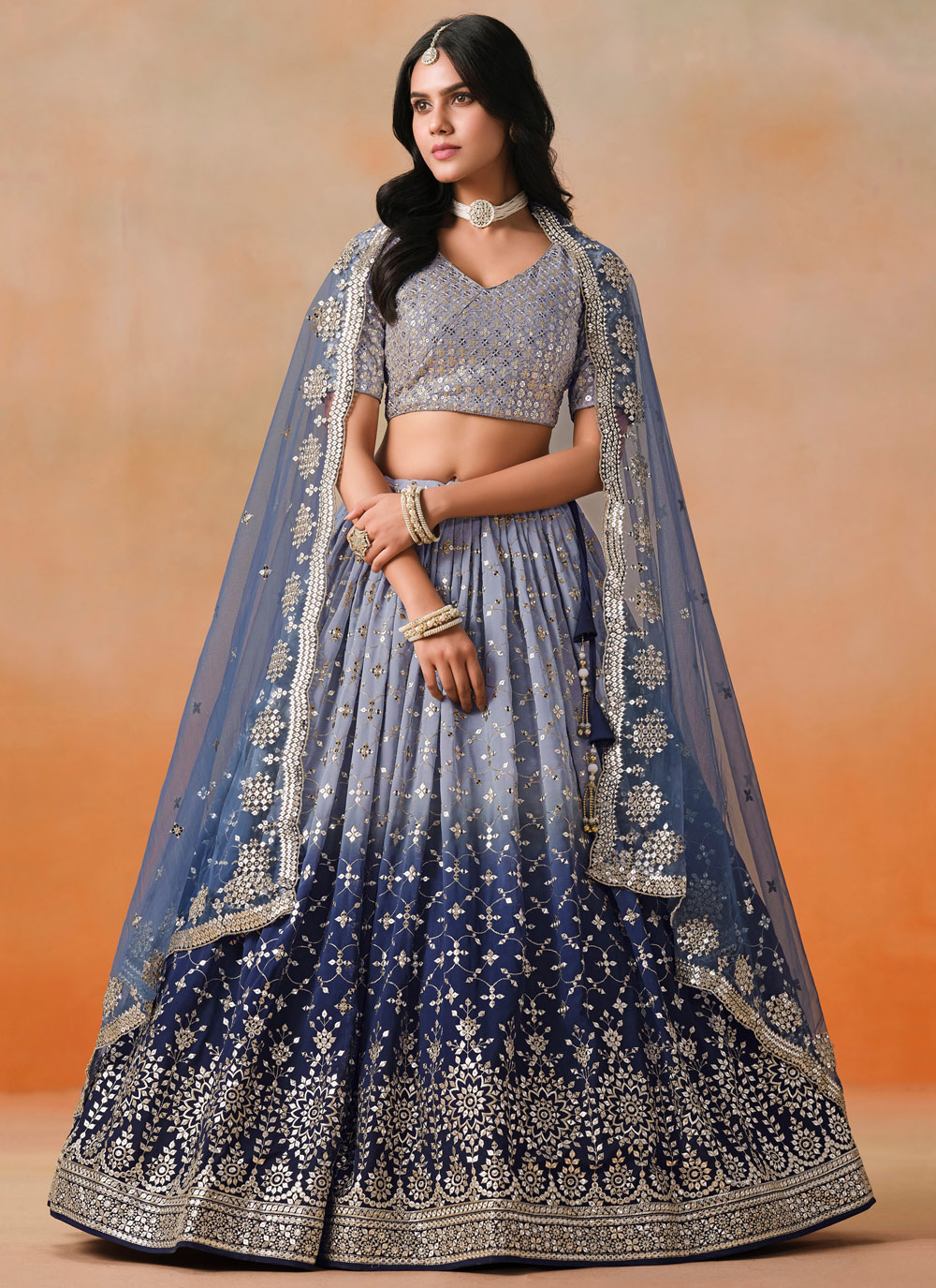 Step into luxury with this designer blue georgette lehenga choli, beautifully adorned with sequins and fine zari work. The long, graceful silhouette makes it ideal for receptions, weddings or festive galas where elegance takes center stage. Comes with matching choli and dupatta.