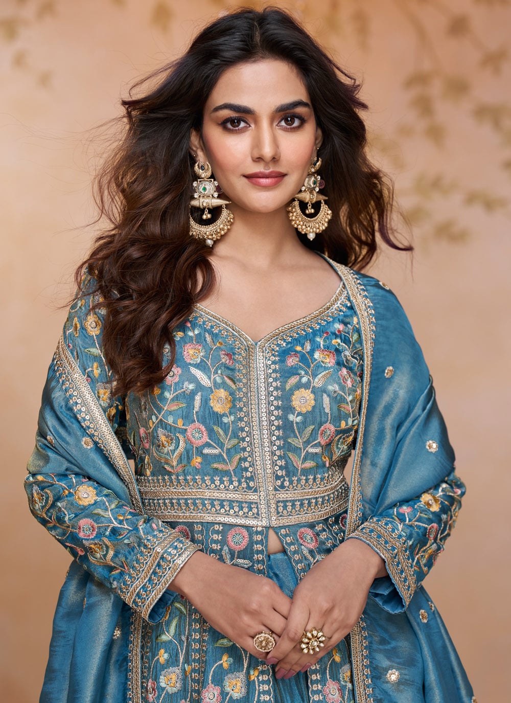A stylish pick for special occasions, this Blue Silk Salwar Kameez features thread work, zari embroidery, and sequin highlights. The shimmer effect of the fabric gives it a graceful appeal. Comes with matching bottom and dupatta.