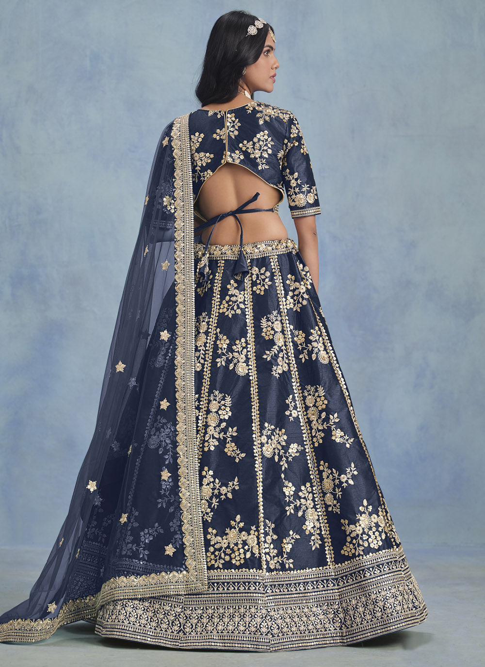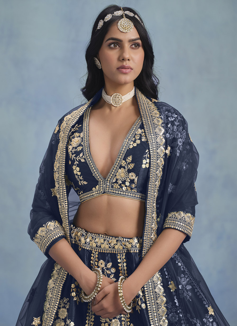 Designed for the woman who loves tradition with a touch of glam, this blue art silk lehenga choli is adorned with detailed thread work and delicate sequins. The rich texture and graceful fall of the fabric make it a standout ensemble for any cultural event. Comes with matching choli and dupatta.