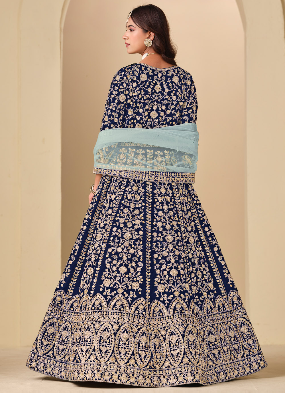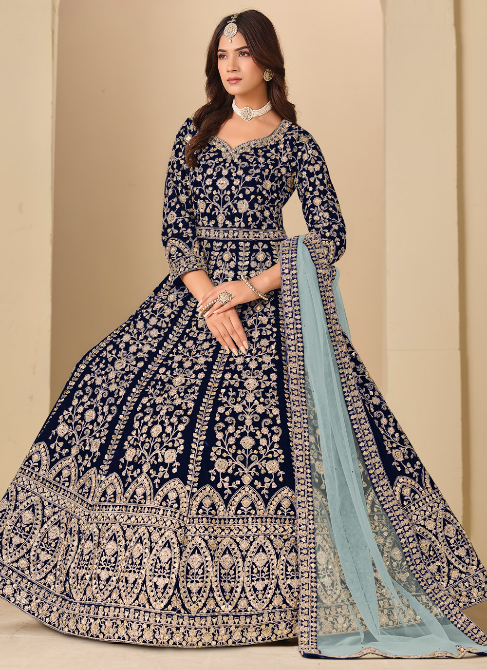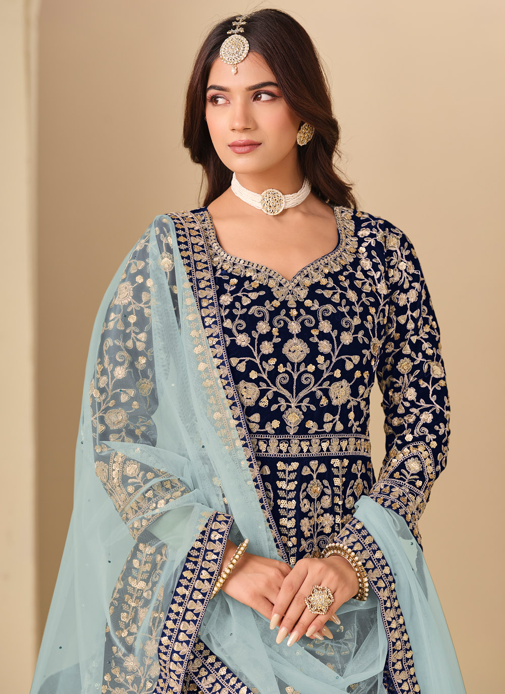 Make a statement at wedding celebrations with this blue velvet embroidered Anarkali salwar kameez. Its refined embroidery and rich fabric ensure a stunning and elegant appearance for special occasions. Comes with matching bottom and dupatta.