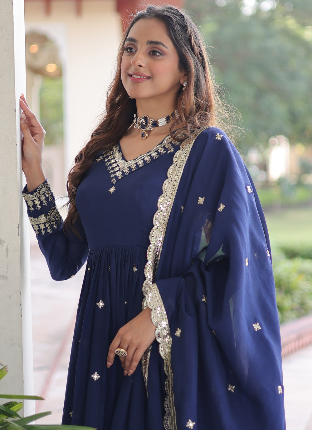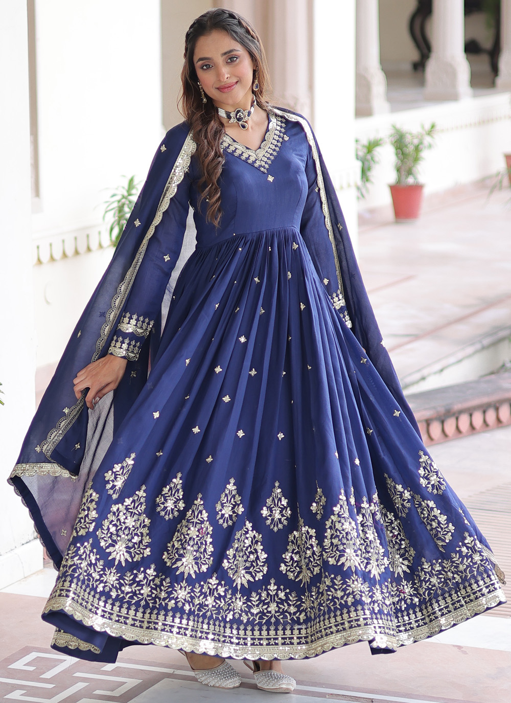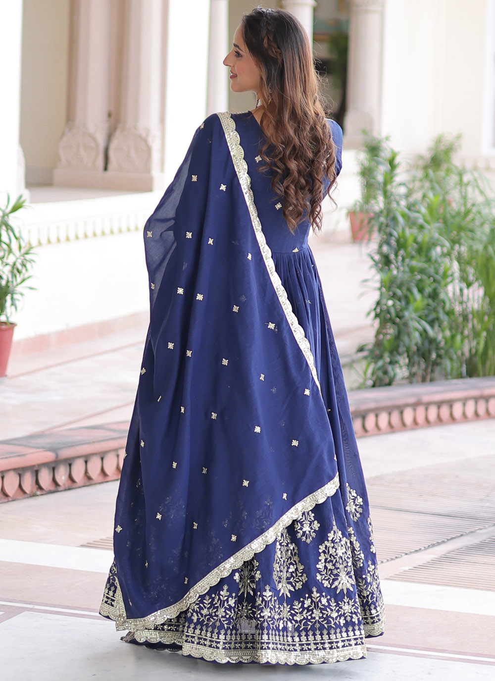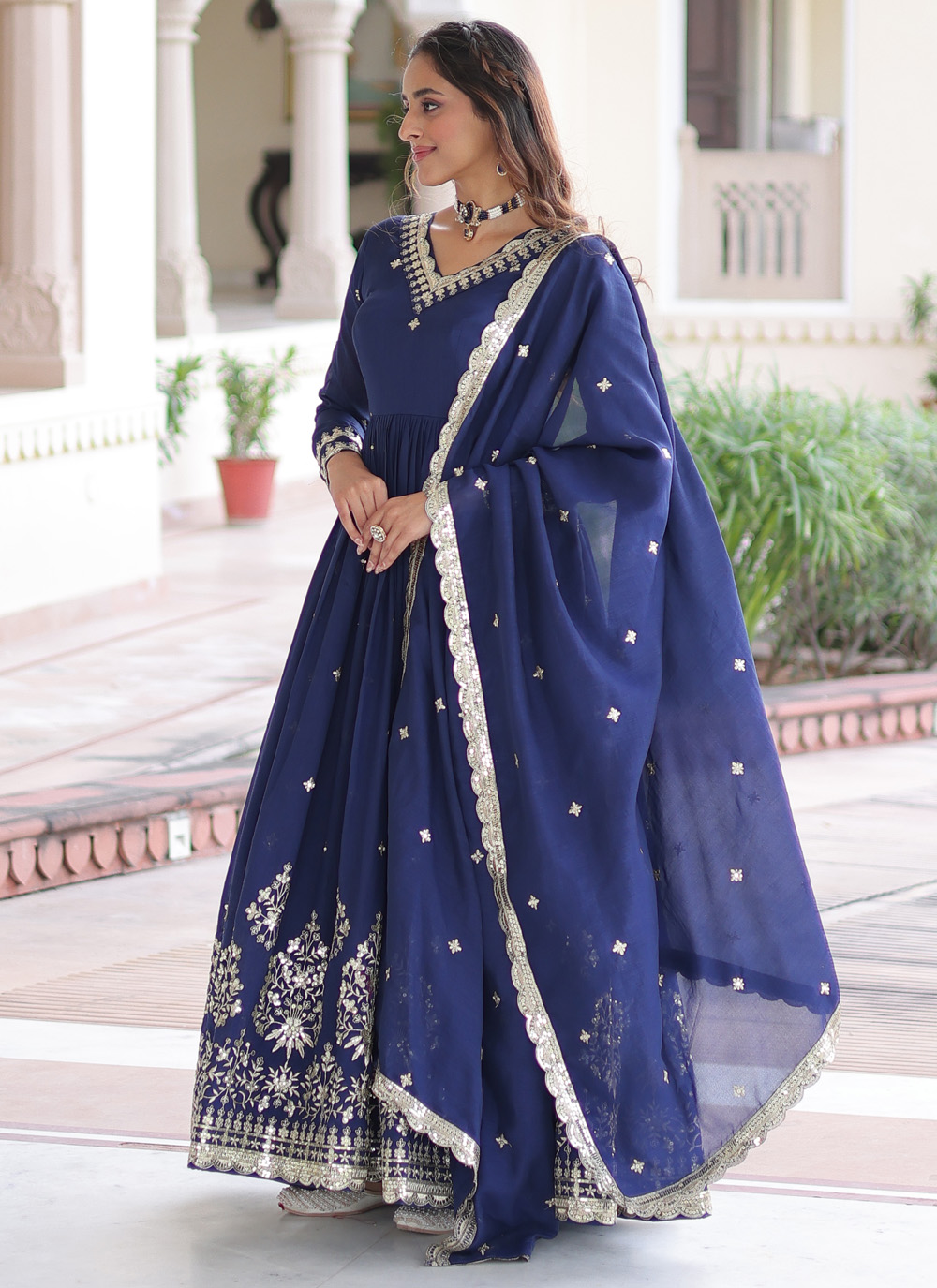 Designed for modern festive wear, this blue gown crafted in vichitra silk features beautiful sequin detailing. Its flowing silhouette and rich color offer a stylish yet comfortable look for festivals and special gatherings. Comes with matching dupatta.