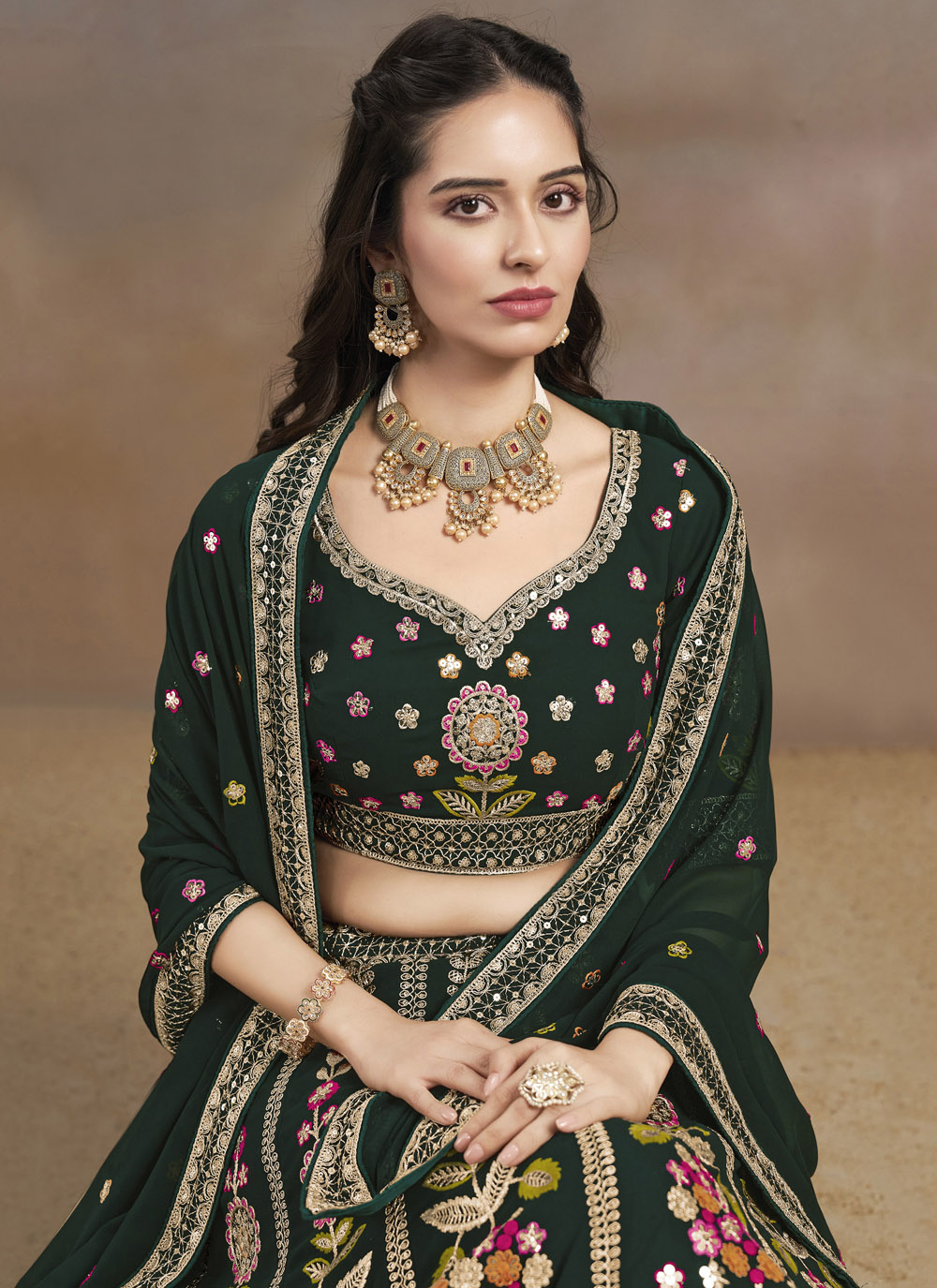 A stunning combination of craftsmanship and color, this green georgette lehenga choli is tailored for modern brides. The intricate dori work and scattered sequins add just the right amount of sparkle for haldi, mehendi or bridal evening events. Comes with matching choli and dupatta.