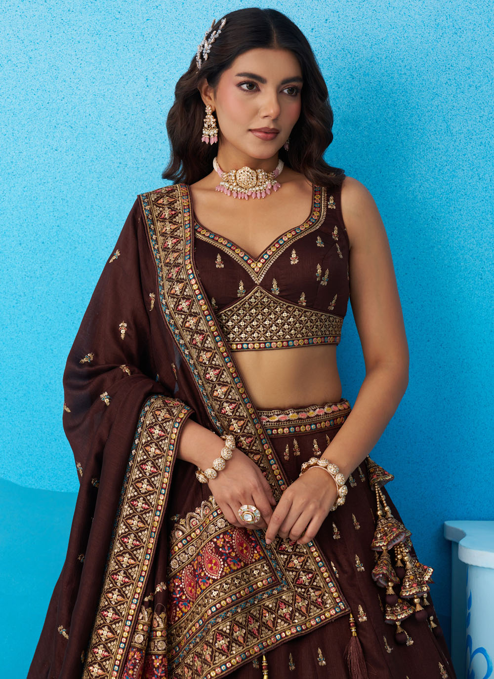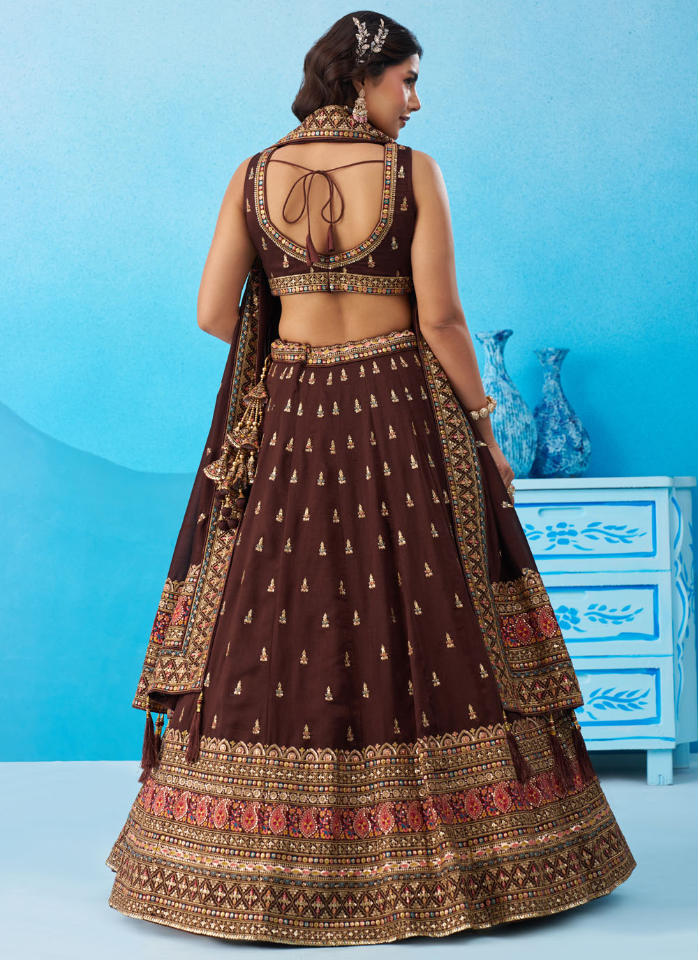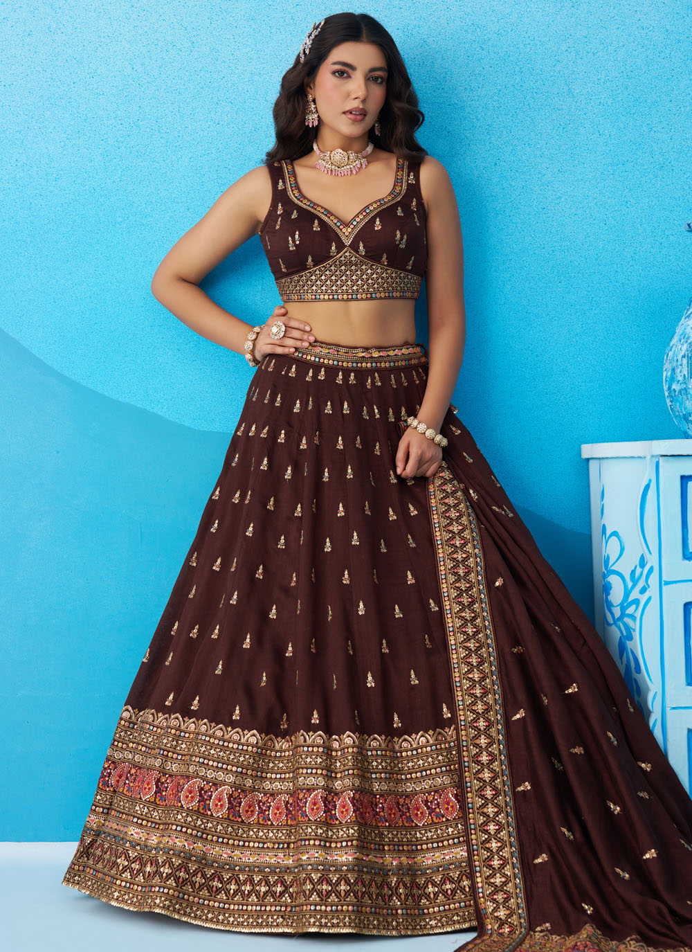 The Brown Chinon Sequins Zari Thread Embroidered Lehenga Choli is a perfect blend of traditional craftsmanship. The intricate embroidery with zari thread and shimmering sequins enhances the richness of the deep brown shade, creating a sophisticated festive look. Comes with matching choli and dupatta.