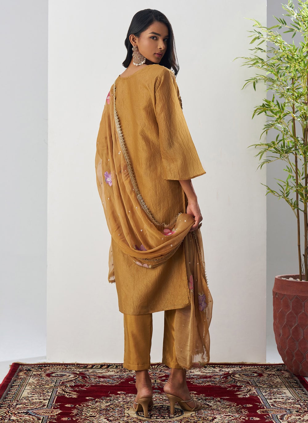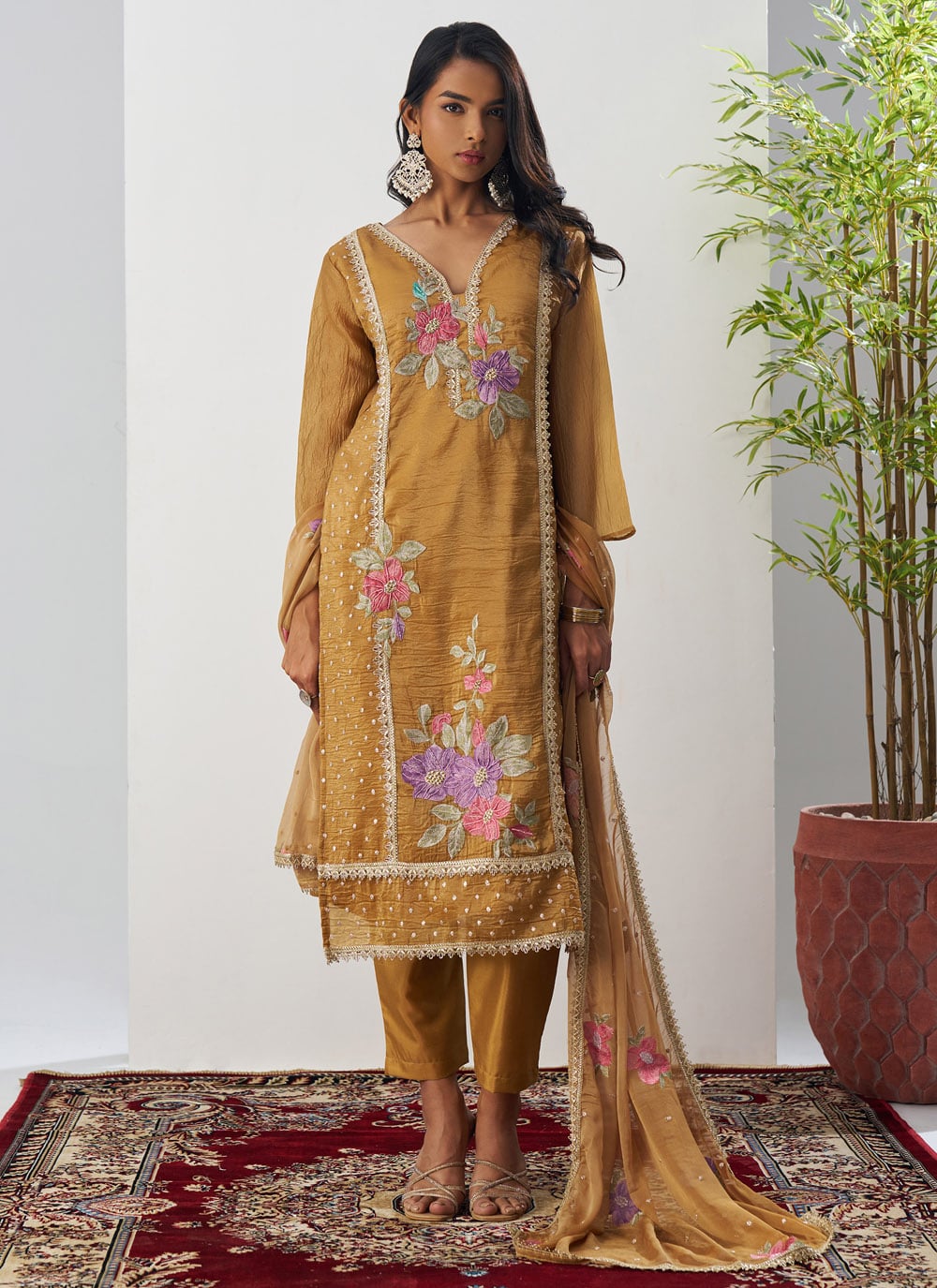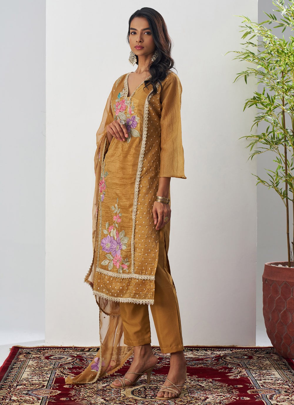 Elevate your ethnic wardrobe with this brown embroidered salwar suit in crush fabric, a modern twist on timeless elegance. The intricate embroidery highlights the richness of the fabric, offering a graceful look for any ceremonial or festive occasion. Comes with matching bottom and dupatta.