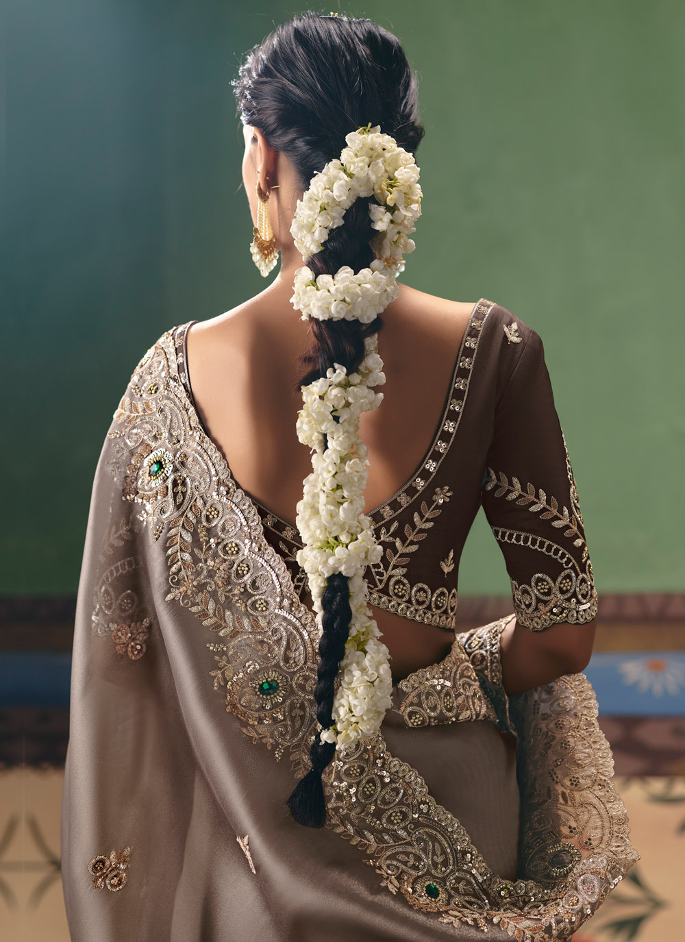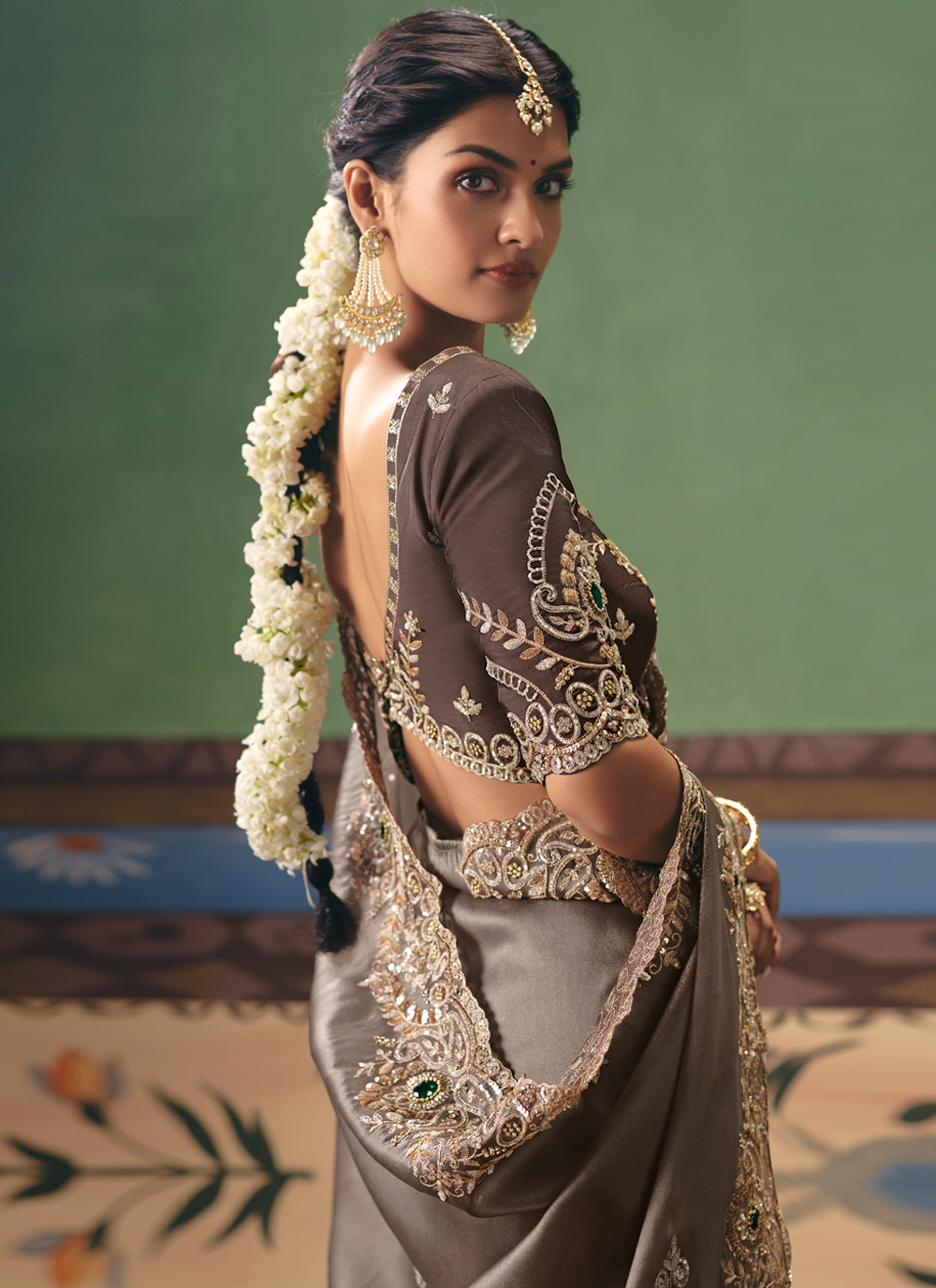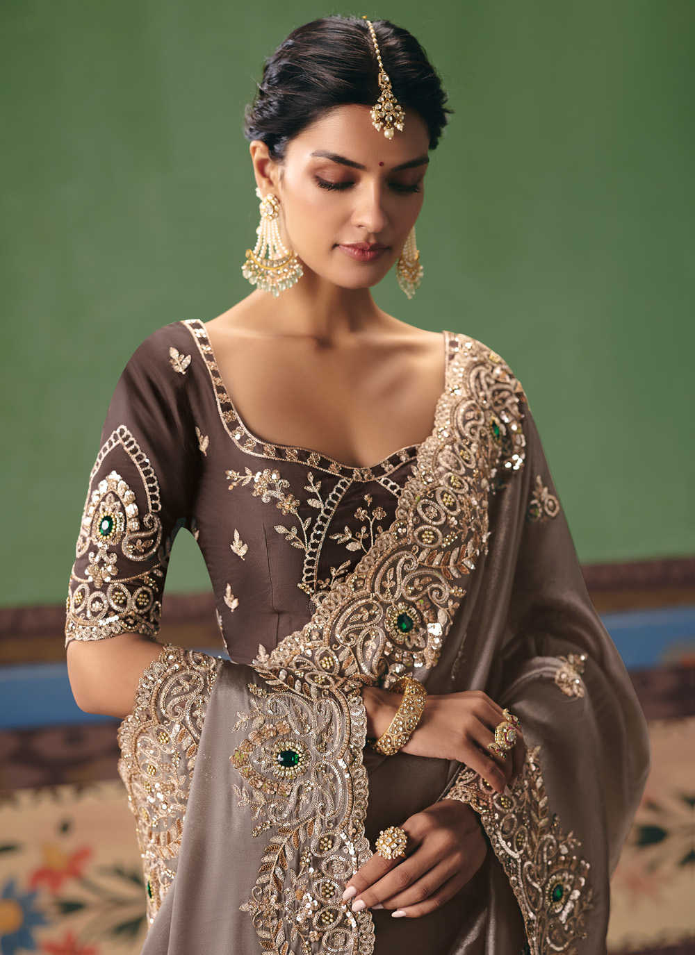 Enhance your special occasion style with this beautifully designed Brown Stone Sequins Embroidered Classic Saree. The soft fancy fabric provides lasting comfort, while the intricate embroidery adds sparkle and depth. Comes with matching blouse.