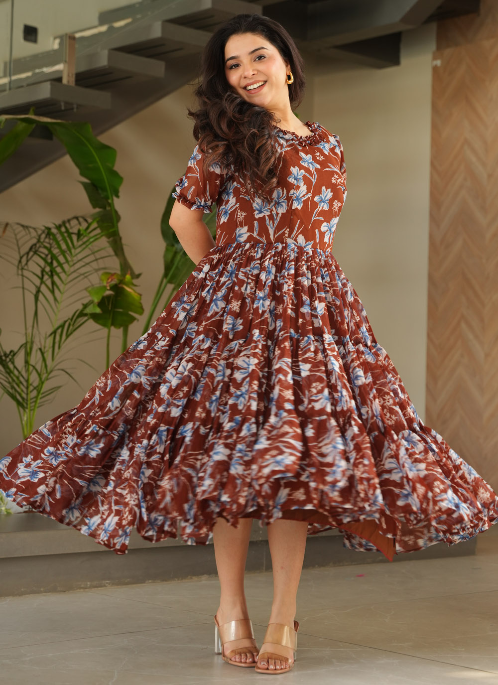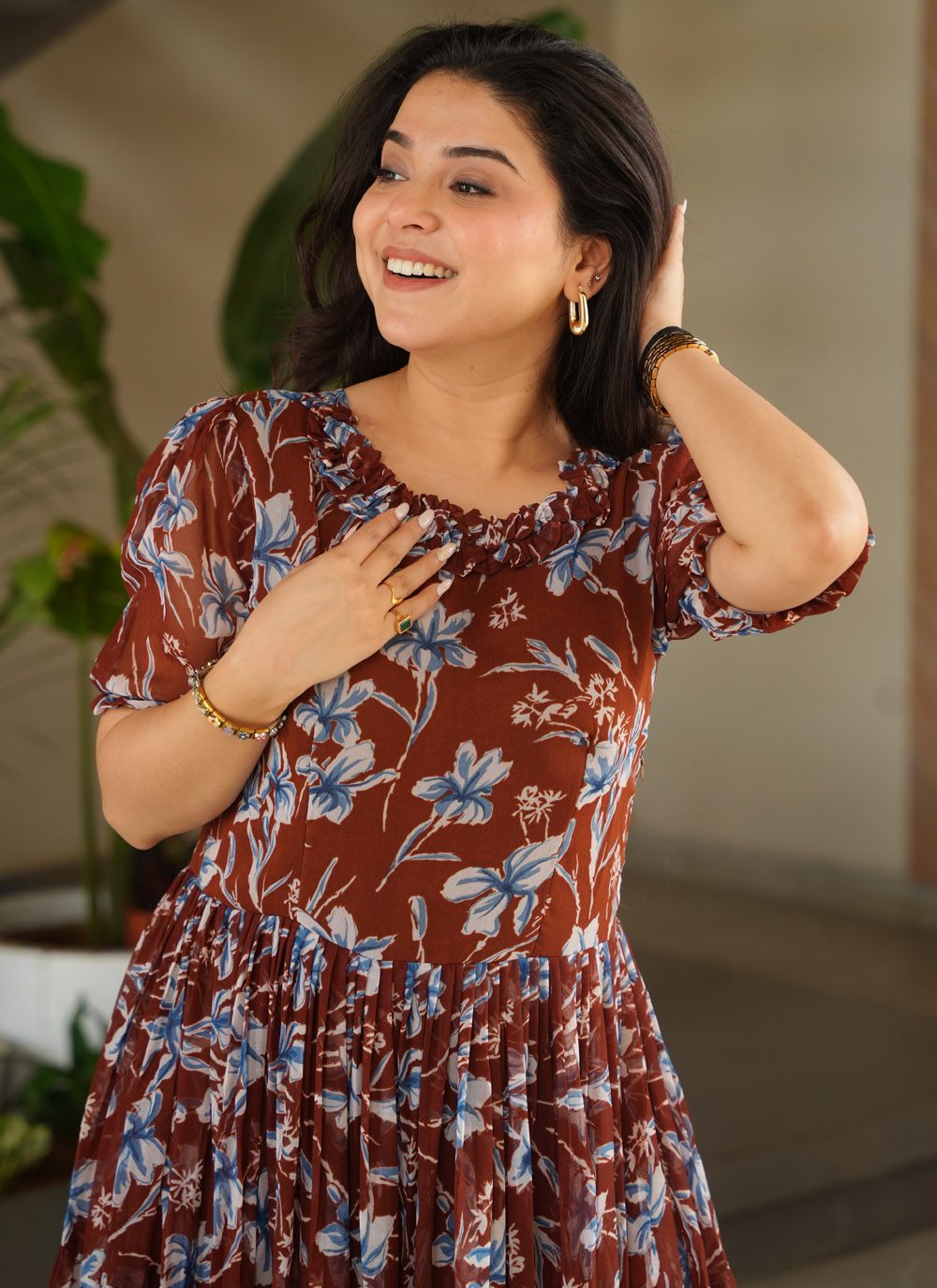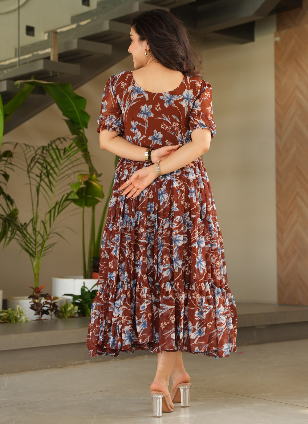 This Brown Floral Print Faux Georgette Gown combines subtle tones with delicate floral artistry, making it a perfect choice for casual functions, festive brunches, or cultural events.