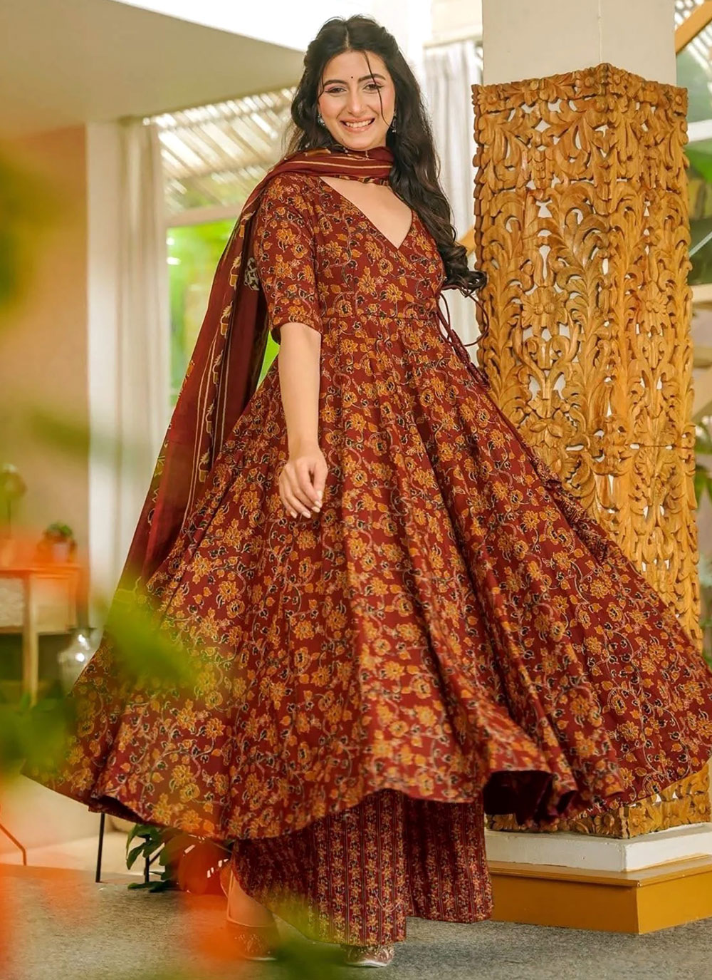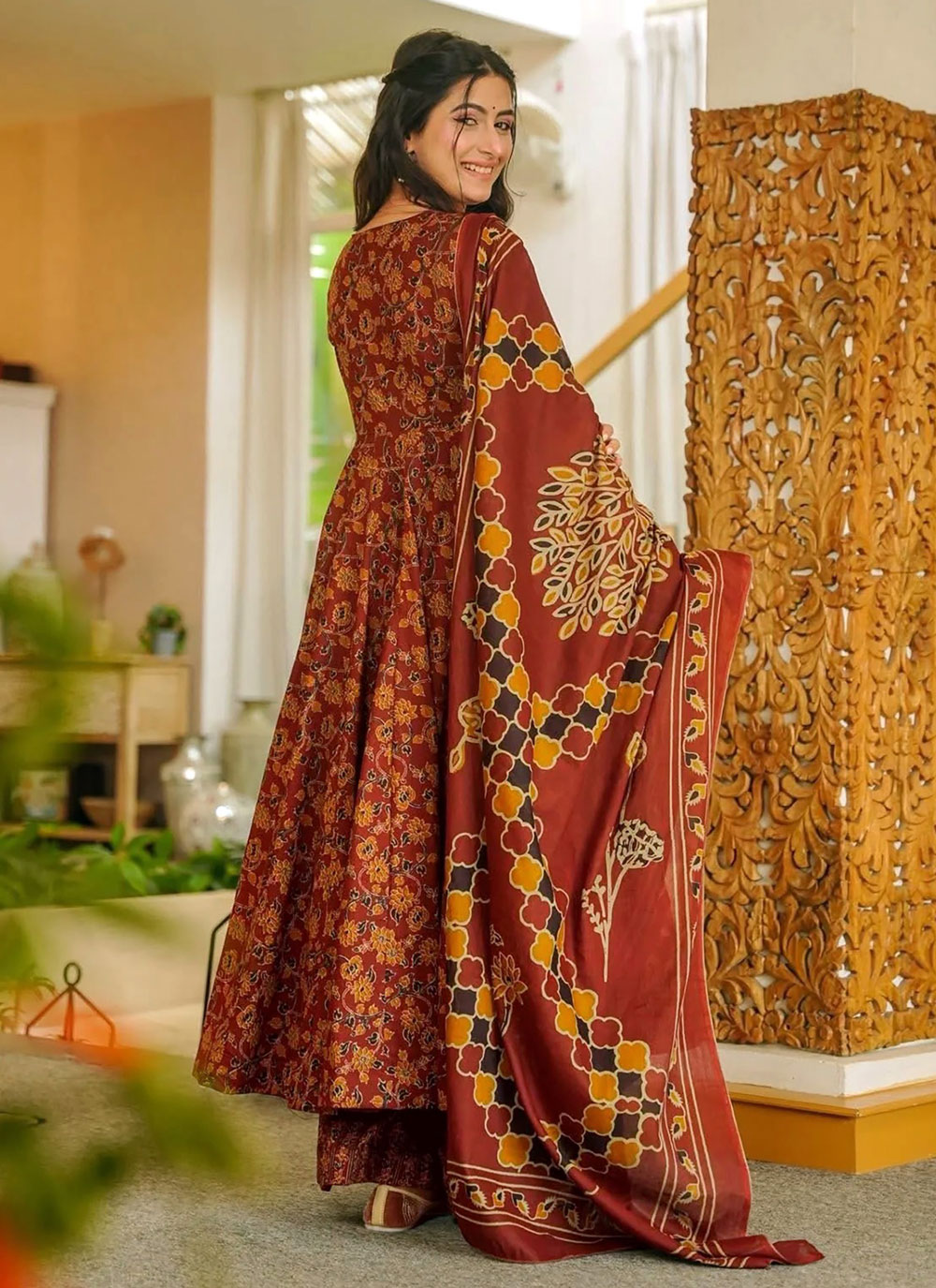 Upgrade your ethnic wardrobe with this Brown Muslin Digital Printed Palazzo Style Salwar Kameez, designed for effortless elegance. The smooth muslin fabric ensures comfort and easy movement, while the detailed digital prints bring a vibrant and trendy touch. Comes with matching blouse. Comes with matching bottom and dupatta.