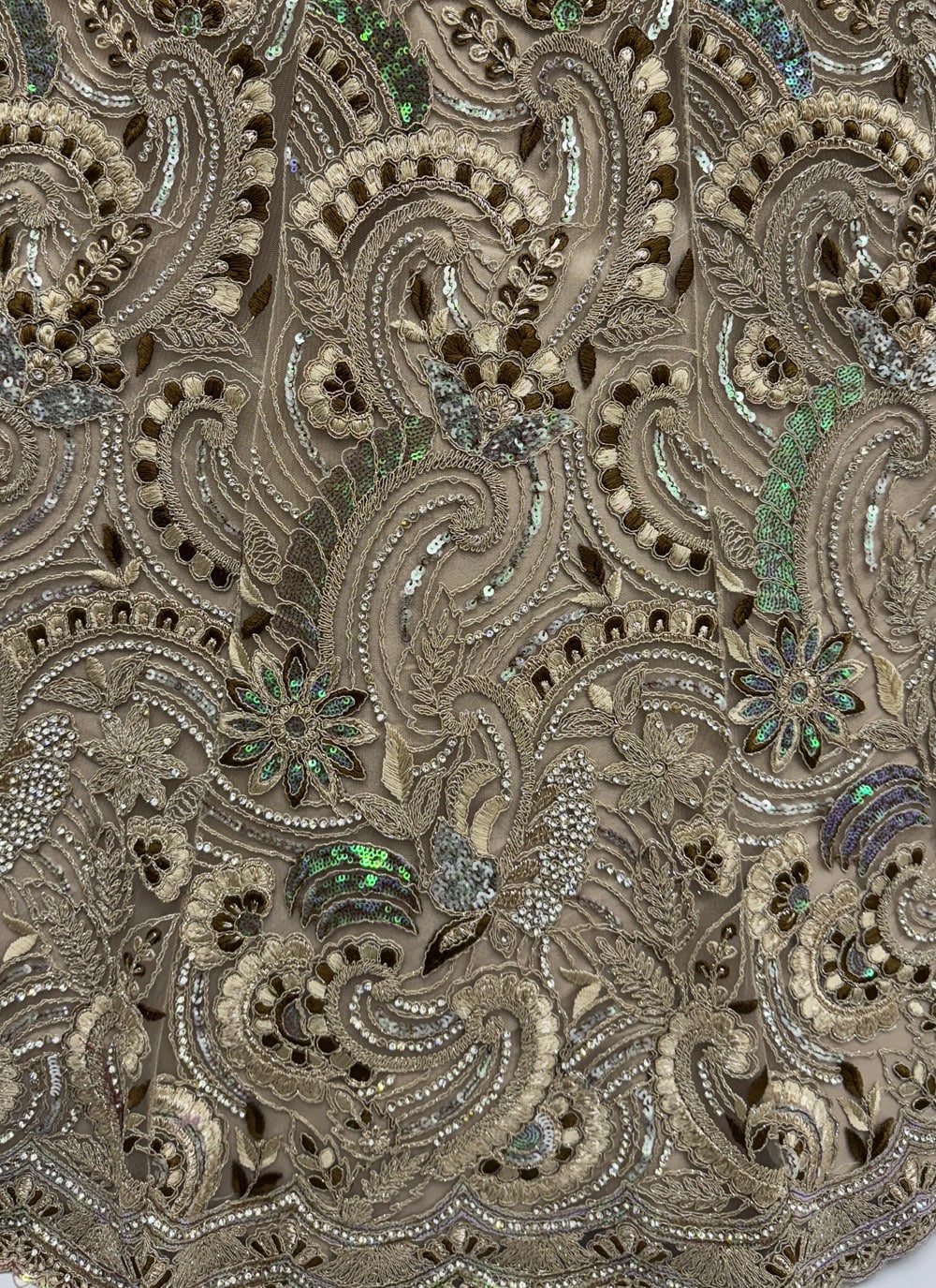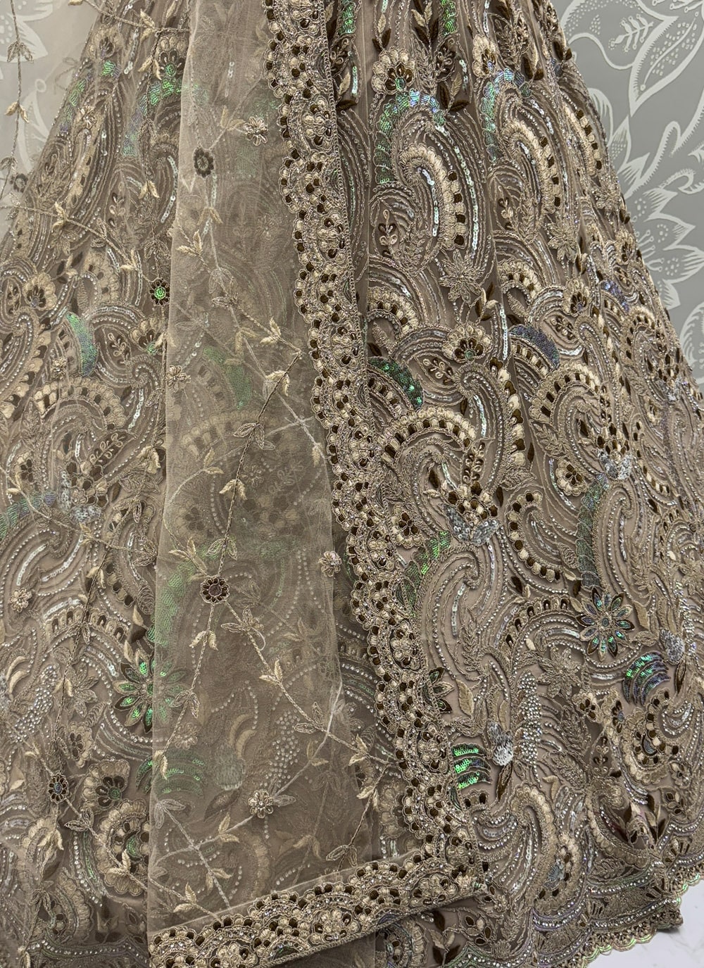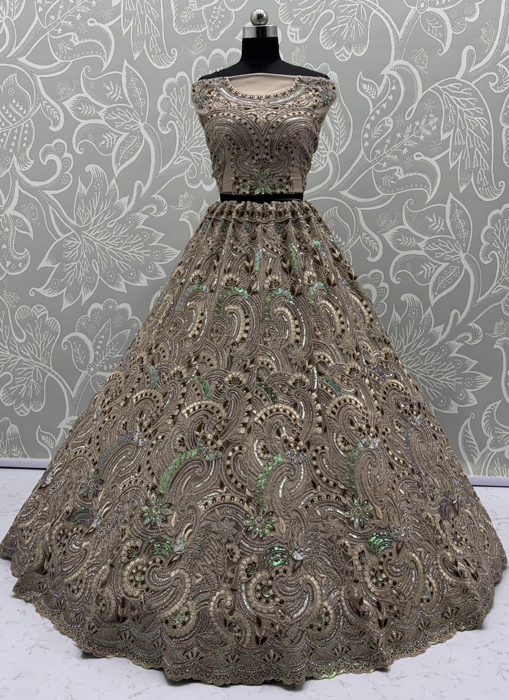 This designer reception lehenga choli in brown net, showcasing multi-thread embroidery, zarkan diamond work, and sequins artistry. The rich detailing brings a stunning sparkle under the lights, making it an ideal outfit for brides or bridesmaids at grand events. Comes with matching choli and dupatta.