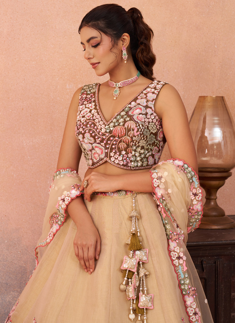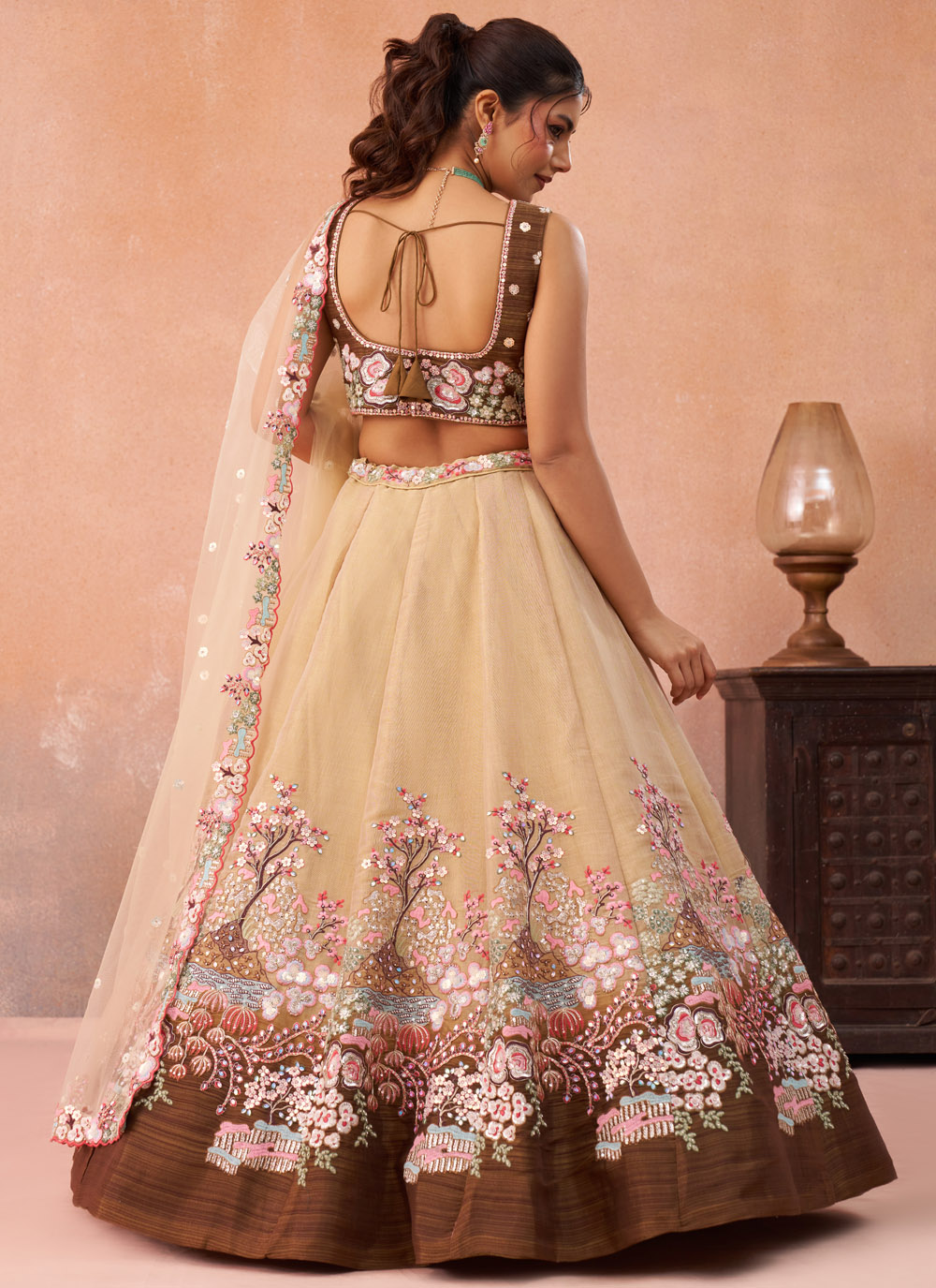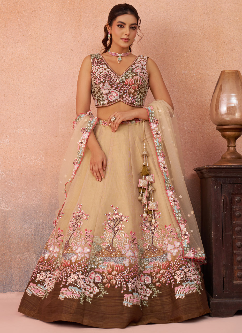 Celebrate special occasions in timeless ethnic fashion with this Brown Net Thread Sequins Embroidery Work Lehenga Choli. The lehenga features detailed thread embroidery enhanced with sparkling sequins, creating an eye-catching pattern that adds charm and glamour to the outfit. Comes with matching choli and dupatta.