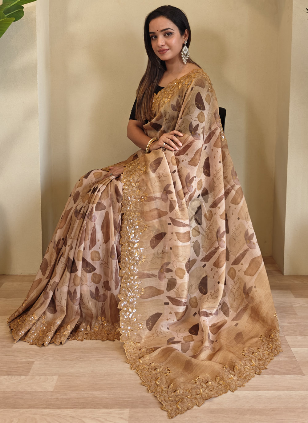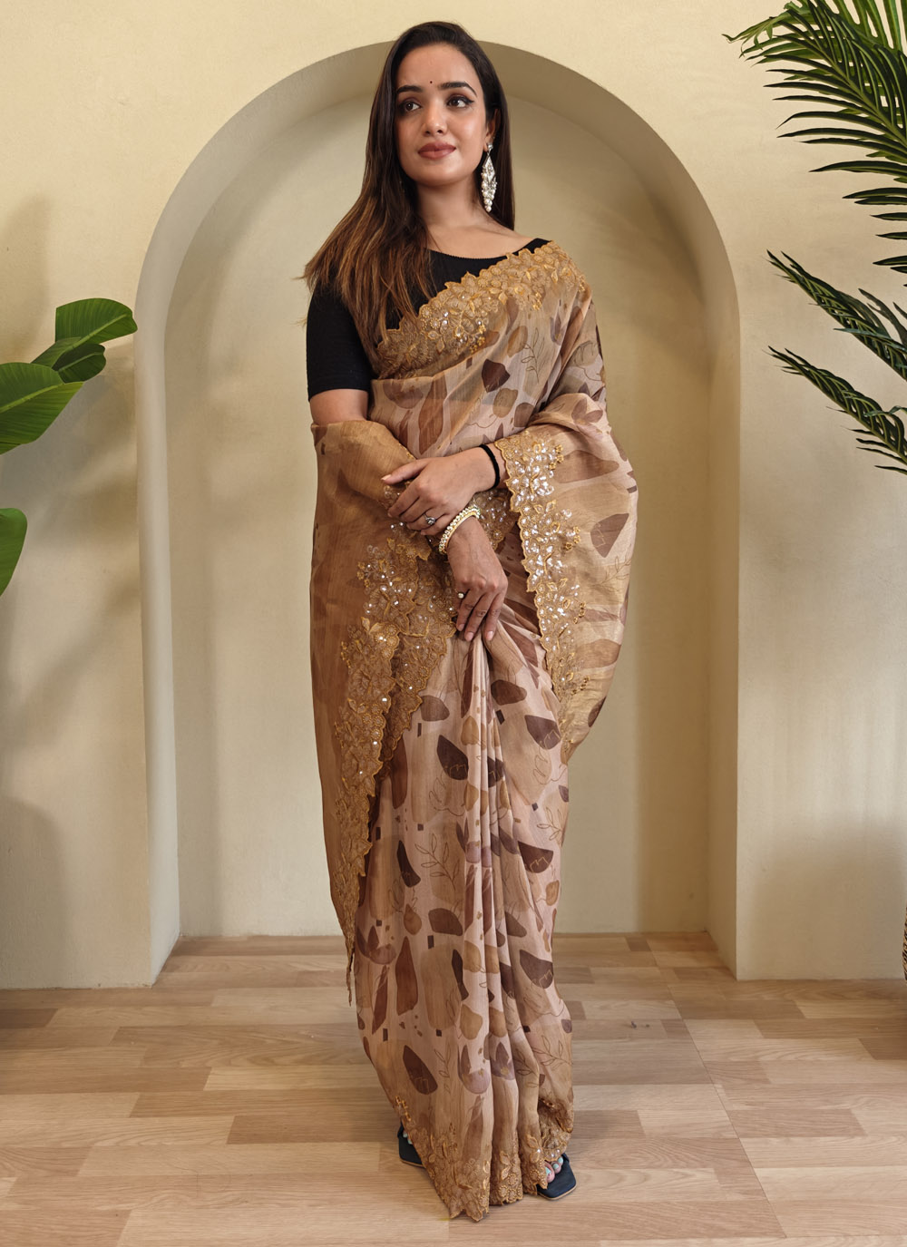 Step into refined beauty with this brown organza saree, digitally printed to reflect modern aesthetics while retaining ethnic charm. The delicate cut work and sequins embroidery add texture and shimmer, ideal for evening events and classic celebrations. Comes with matching blouse.