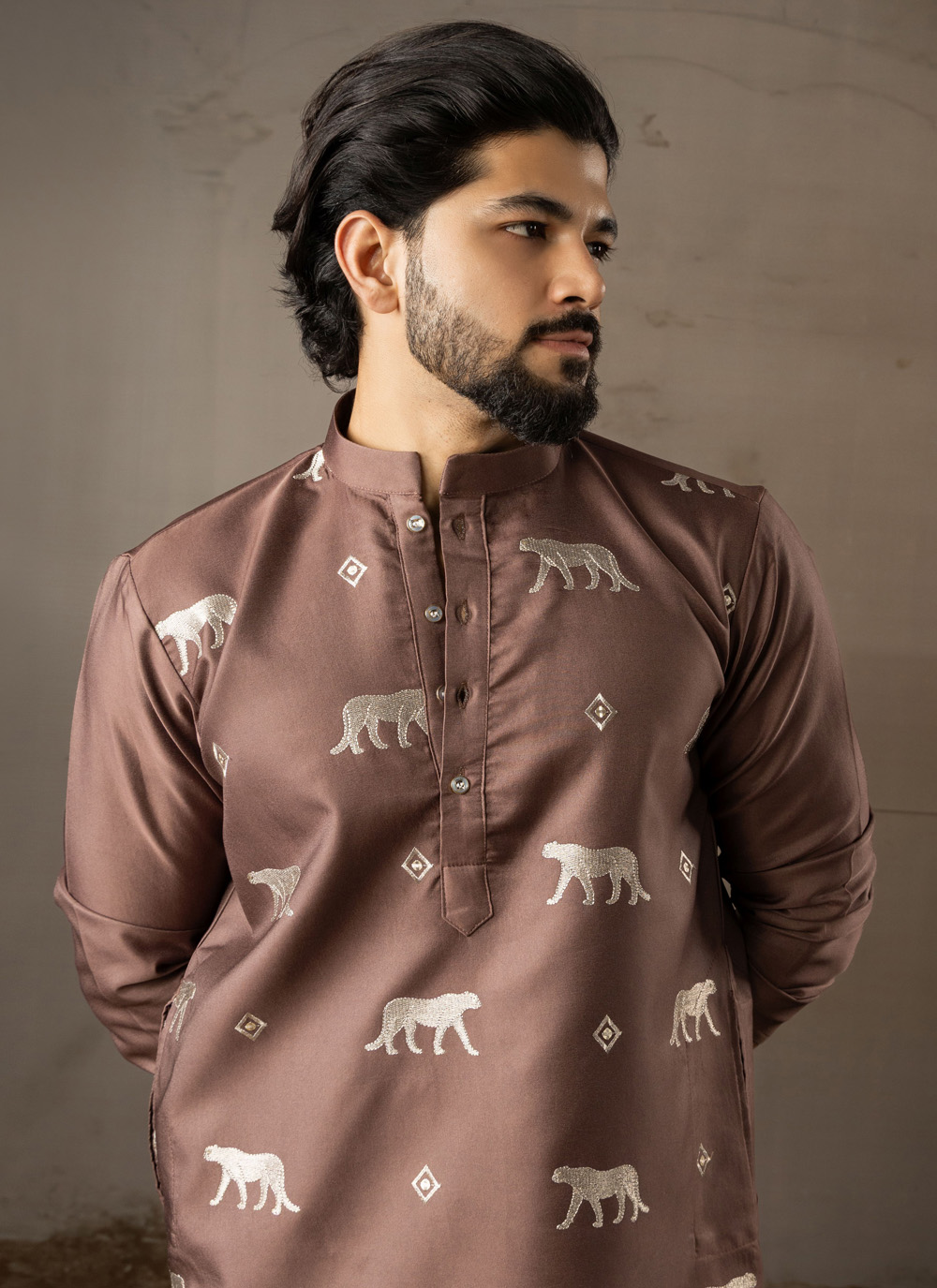 This embroidered brown rayon kurta pyjama blends classic design with contemporary comfort. The intricate threadwork adds richness.