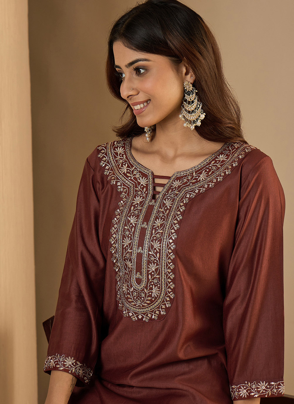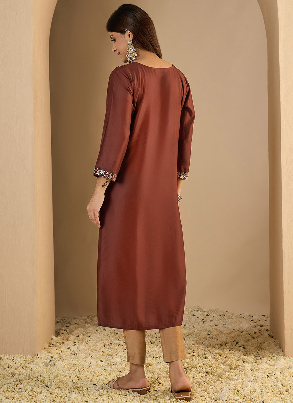This brown silk blend kurti features beautiful embroidery that highlights its graceful and modern appeal. The rich brown shade offers a warm and sophisticated look, while the breathable fabric ensures all-day comfort.