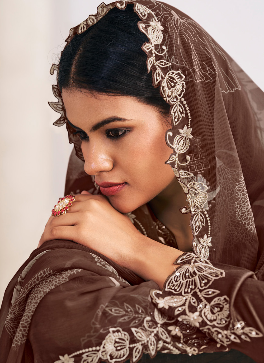 Elevate your wardrobe with this brown designer silk salwar kameez. The intricate embroidery adds sophistication, while the ready-to-wear design ensures effortless style for festive occasions and formal events. Comes with matching bottom and dupatta.