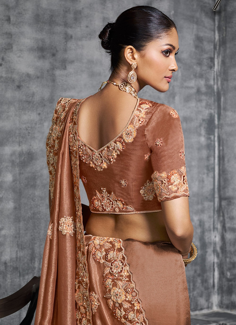 This embroidered tissue saree in brown is adorned with resham artistry highlighted by sparkling sequins and stone work. Its rich tone makes it ideal for evening receptions or festive gatherings. Comes with matching blouse.