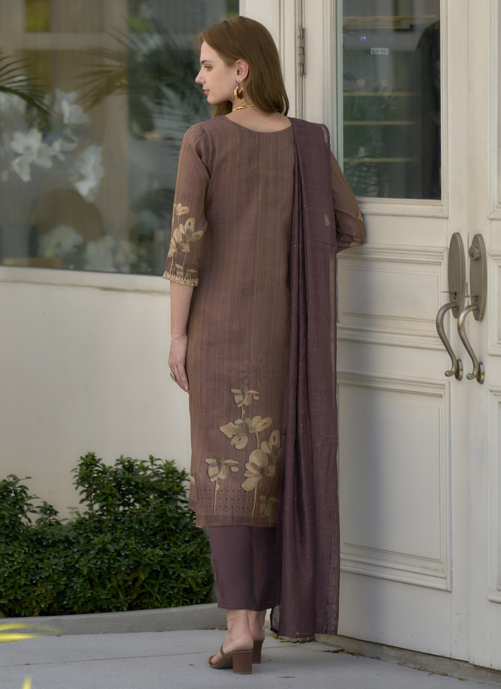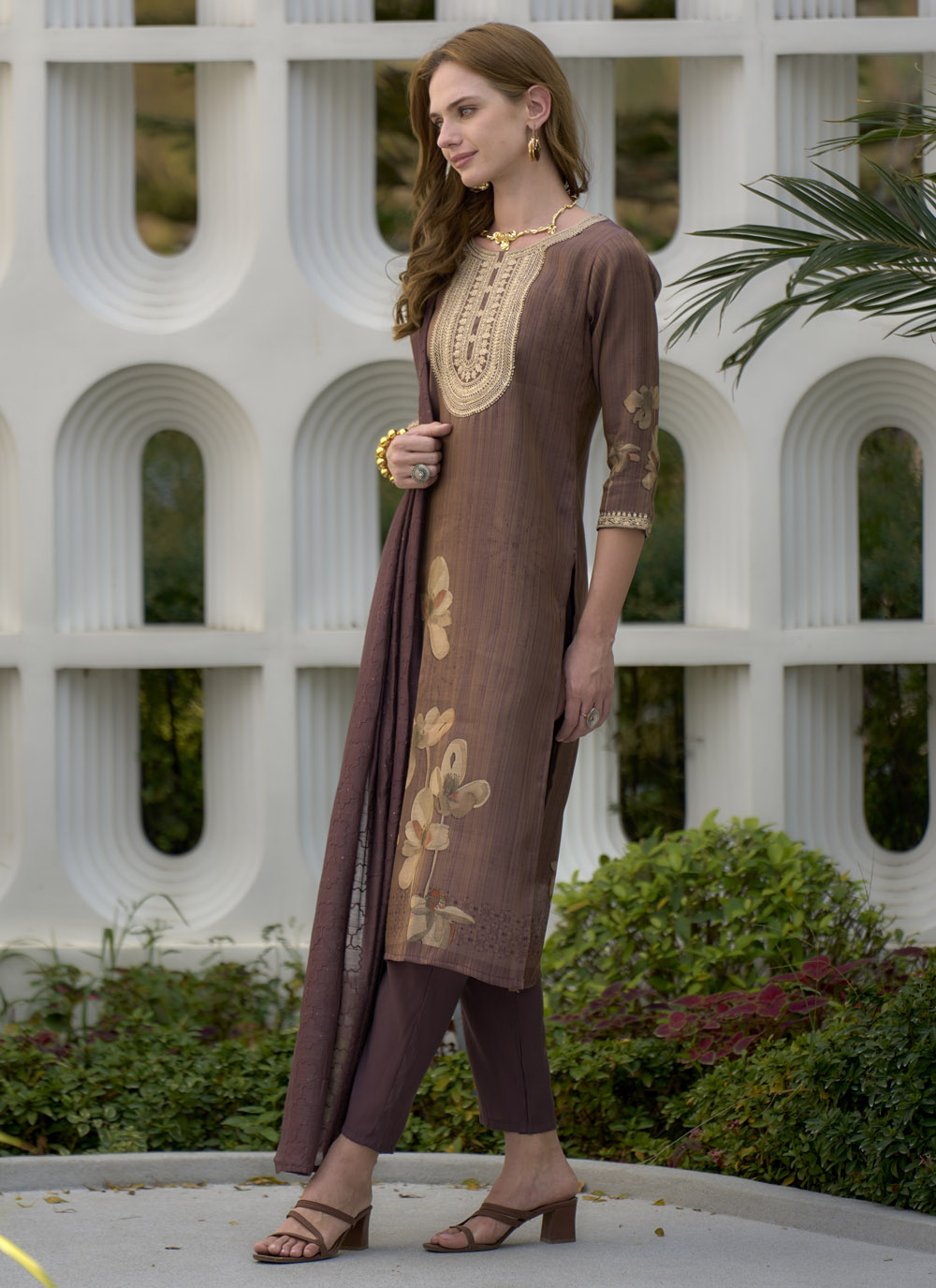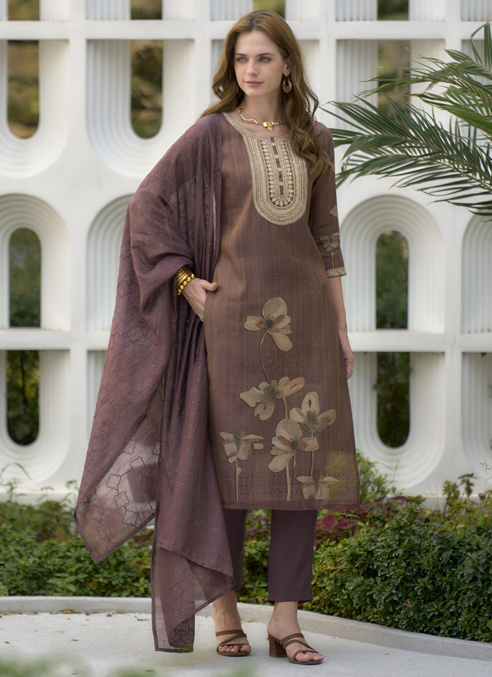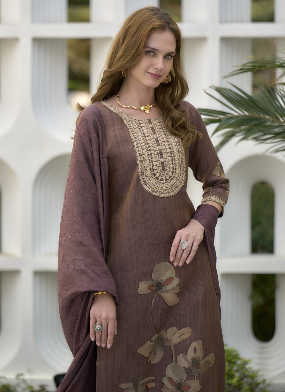 This Brown Tissue Zari Embroidered & Floral Printed Salwar Kameez is a wearable piece of art, showcasing meticulous craftsmanship in every detail. The unique brown tissue fabric provides a subtle sheen, while the intricate Zari embroidery adds a touch of golden grandeur, contrasting beautifully with the soft, artistic floral prints. Comes with matching bottom and dupatta.