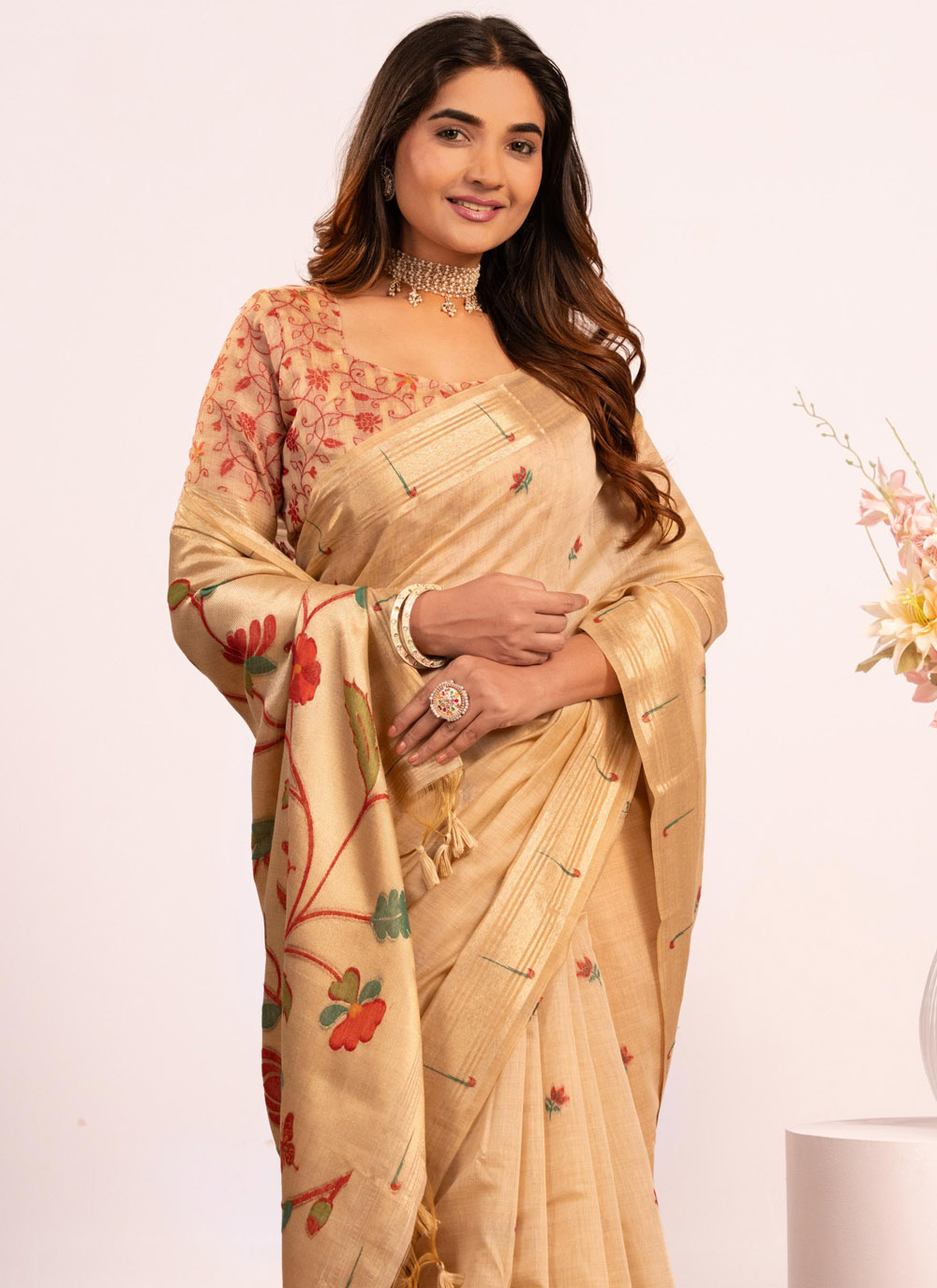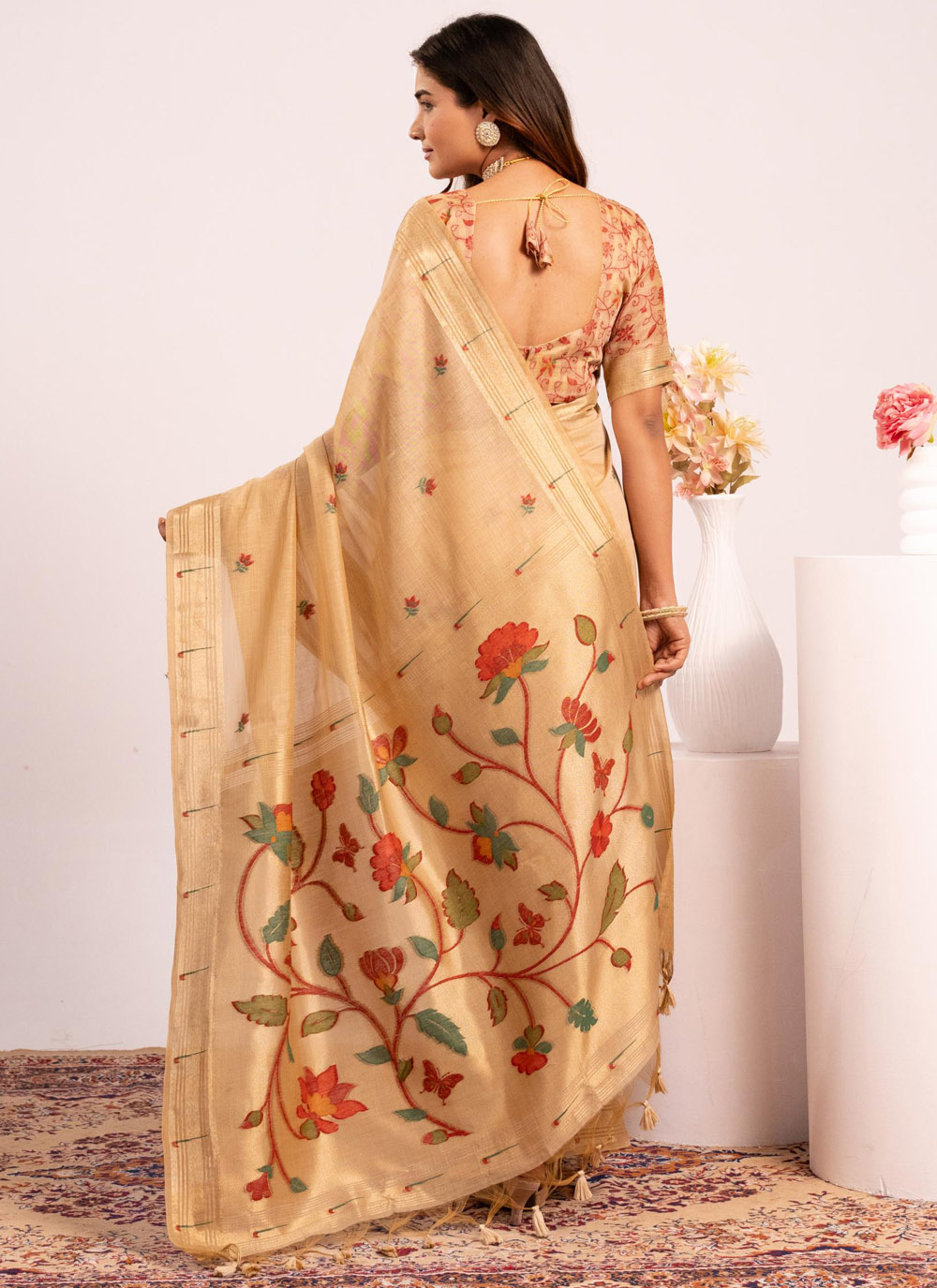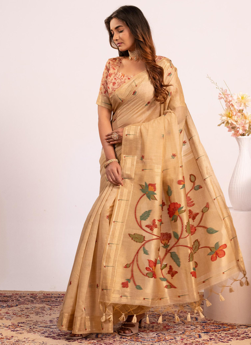 Crafted for festive elegance, this brown cotton saree delivers comfort with timeless design. The weaving work adds depth, making it a versatile choice for celebrations and gatherings. Comes with matching blouse.