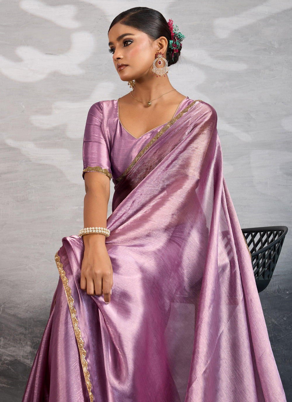 Grace every celebration in this enchanting Lavender Burberry Chiffon Saree, adorned with delicate beads and shimmering cut dana work. The soft flow of chiffon, paired with a contrasting patch border, creates a perfect balance of elegance and contemporary flair. Comes with matching blouse.