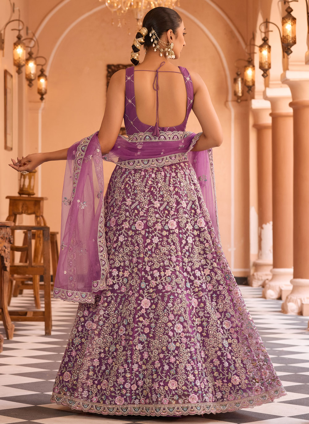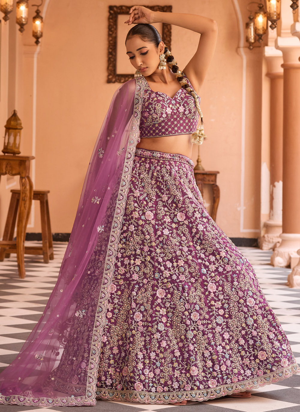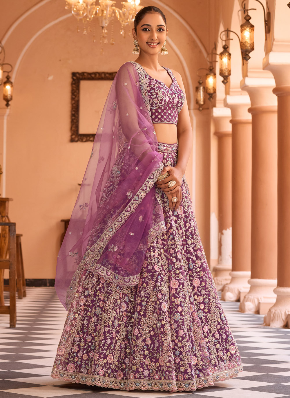 This burgundy designer lehenga choli showcases flawless craftsmanship over premium net fabric. The skirt features intricate stone and sequin embellishments arranged in elegant floral and geometric patterns, enhancing its appearance. Comes with matching choli and dupatta.