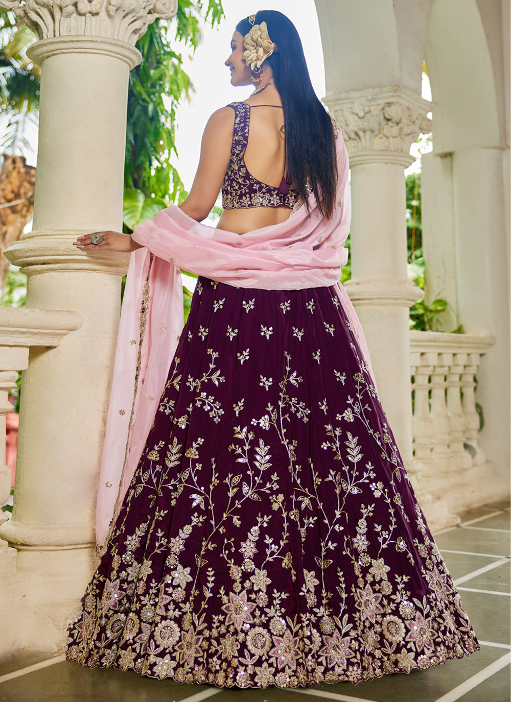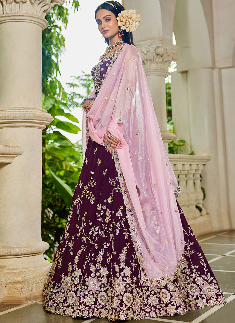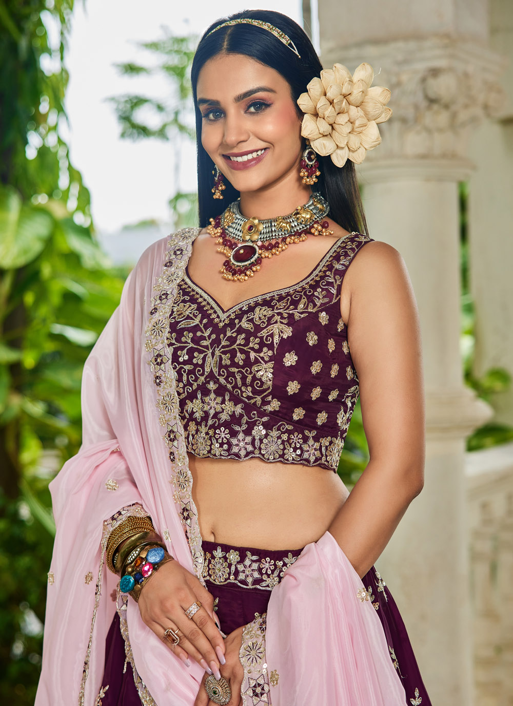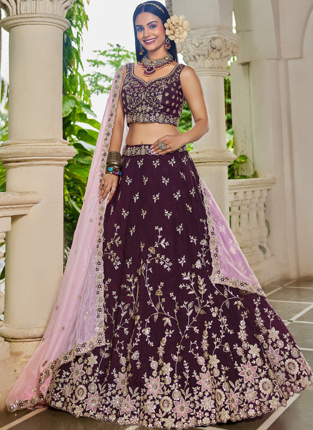 Drape yourself in grace with this burgundy organza lehenga choli, exquisitely adorned with thread and sequin embroidery. Its sheer elegance and rich color make it a perfect pick for weddings, receptions and festivals. Comes with matching choli and dupatta.