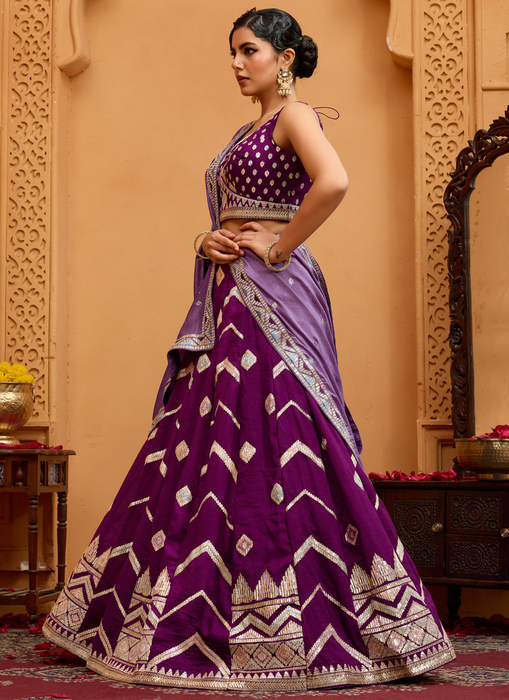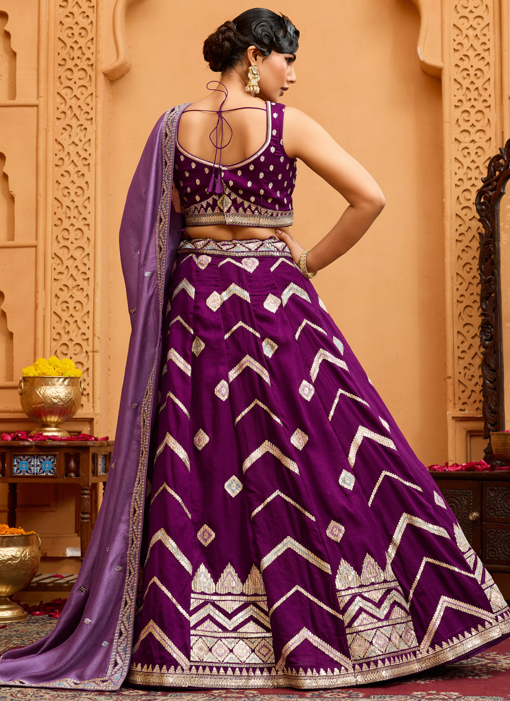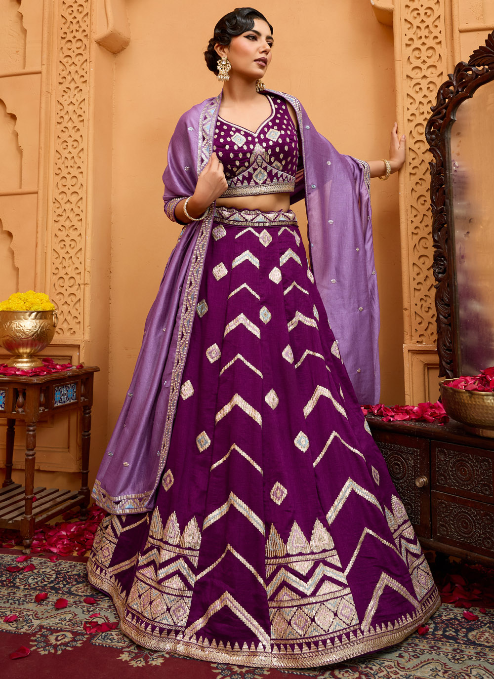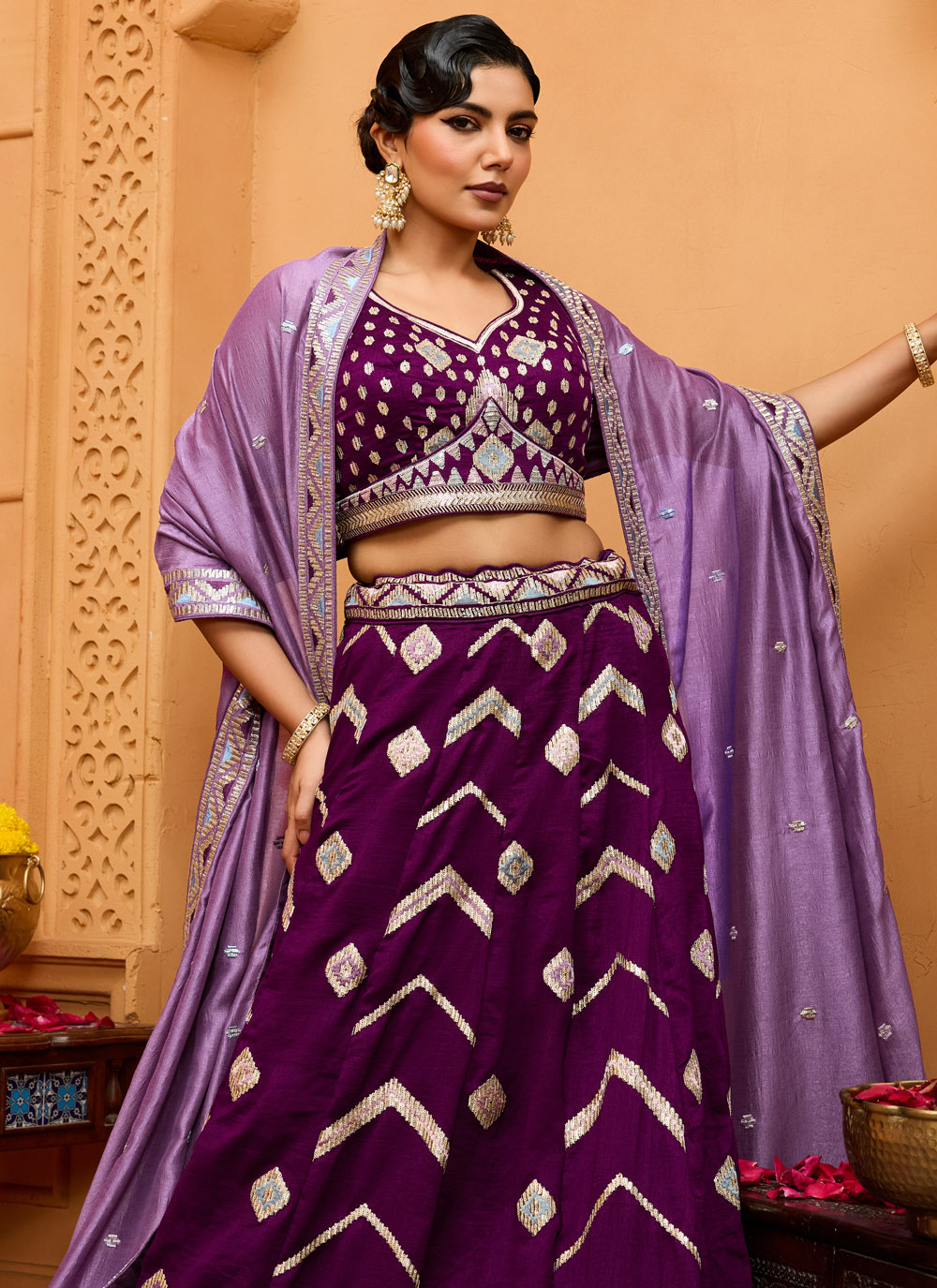 Grace every celebration with this burgundy silk lehenga choli, exquisitely detailed with shimmering sequins embroidery. The rich silk fabric drapes beautifully, adding a royal touch to your look. Perfect for weddings or receptions. Comes with matching choli and dupatta.