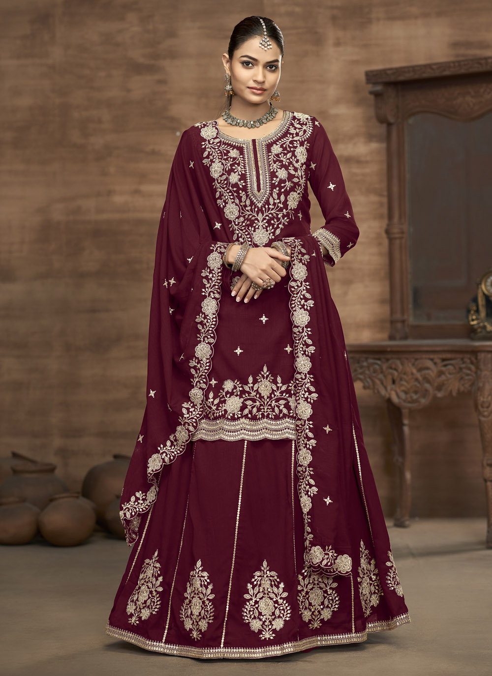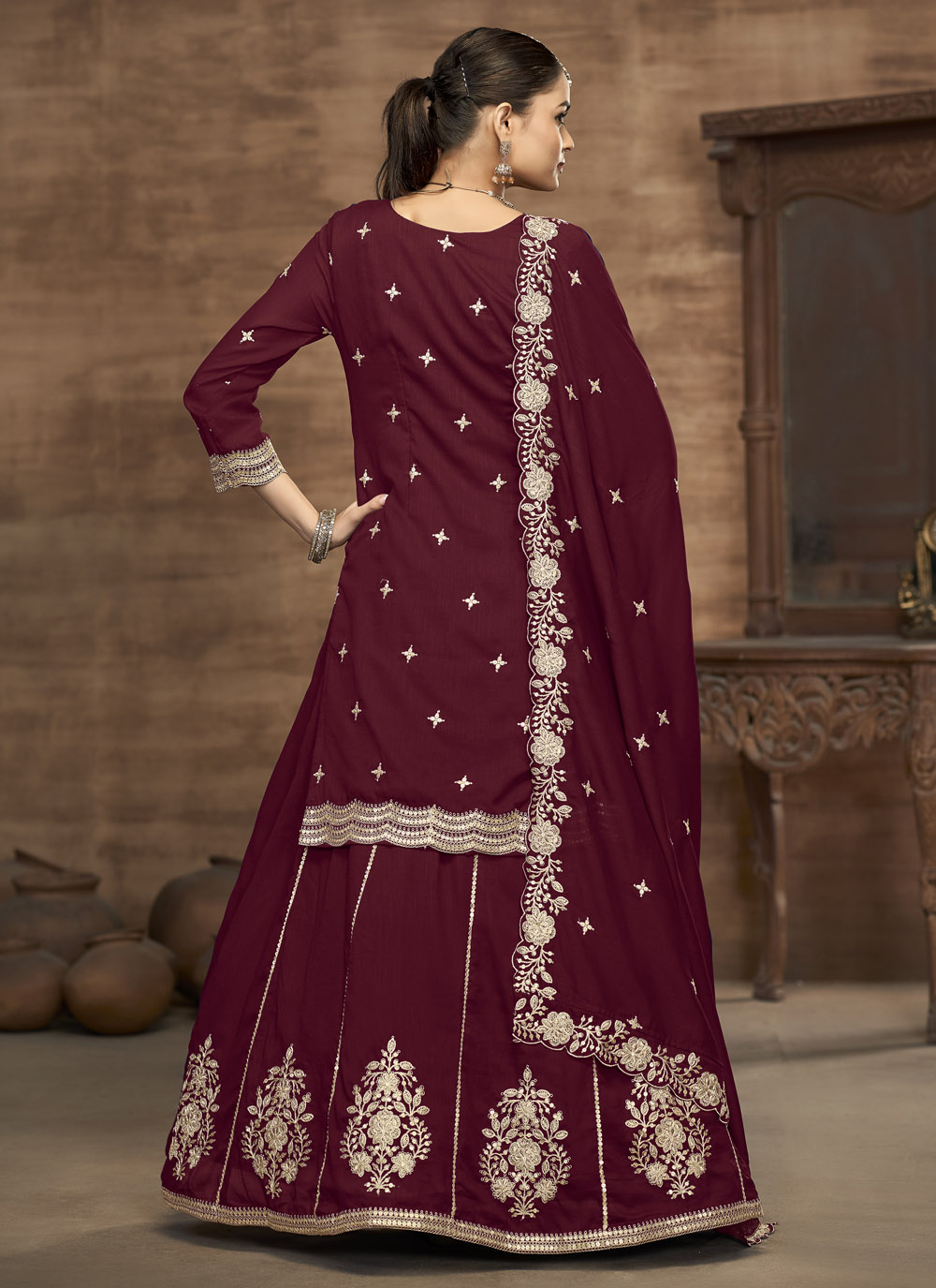 Elevate your festive wardrobe with this burgundy Vichitra silk lehenga choli highlighted by ornate zari and sequins embroidery. Its opulent colour and exquisite craftsmanship make it a standout ensemble for receptions and special occasions. Comes with matching choli and dupatta.
