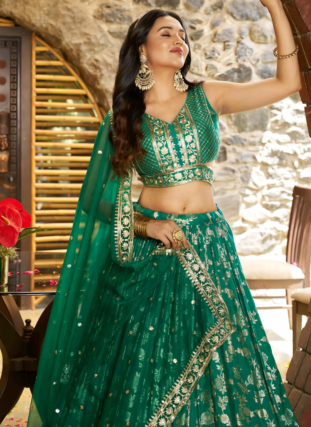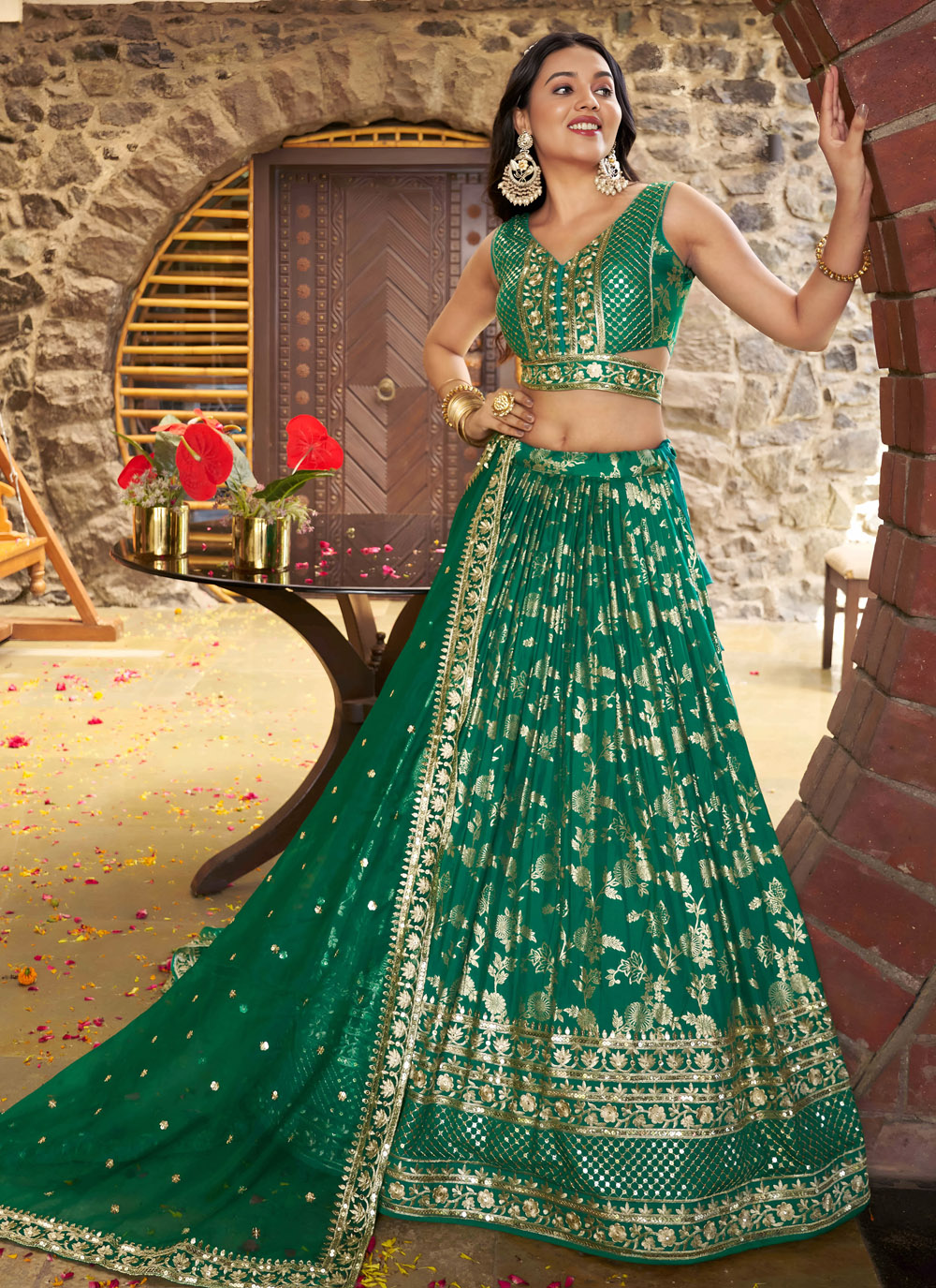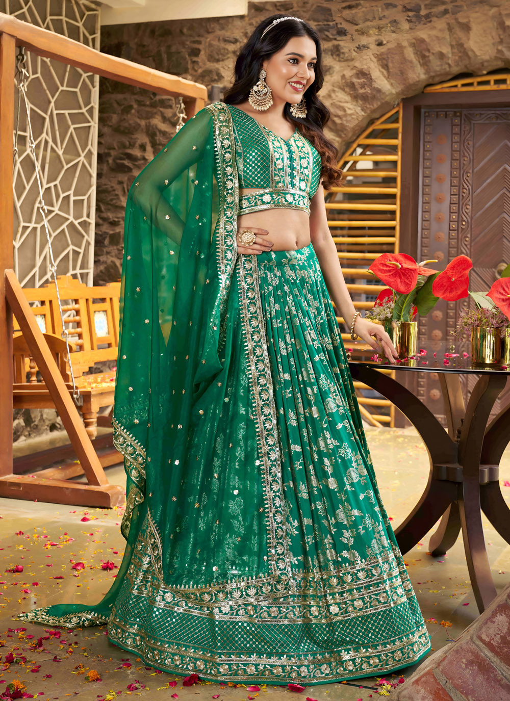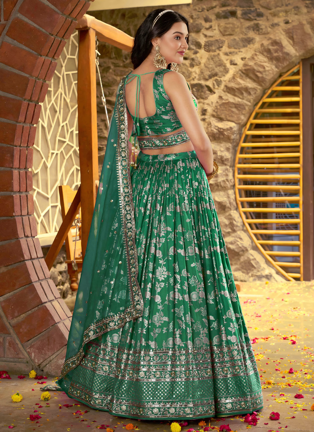 Elevate your occasion wear with this trendy ceremonial green lehenga choli featuring intricate zari embroidery and sparkling sequins. The soft, flowing silhouette drapes gracefully, making it a statement ensemble for receptions, festive parties or cultural events. Comes with matching choli and dupatta.