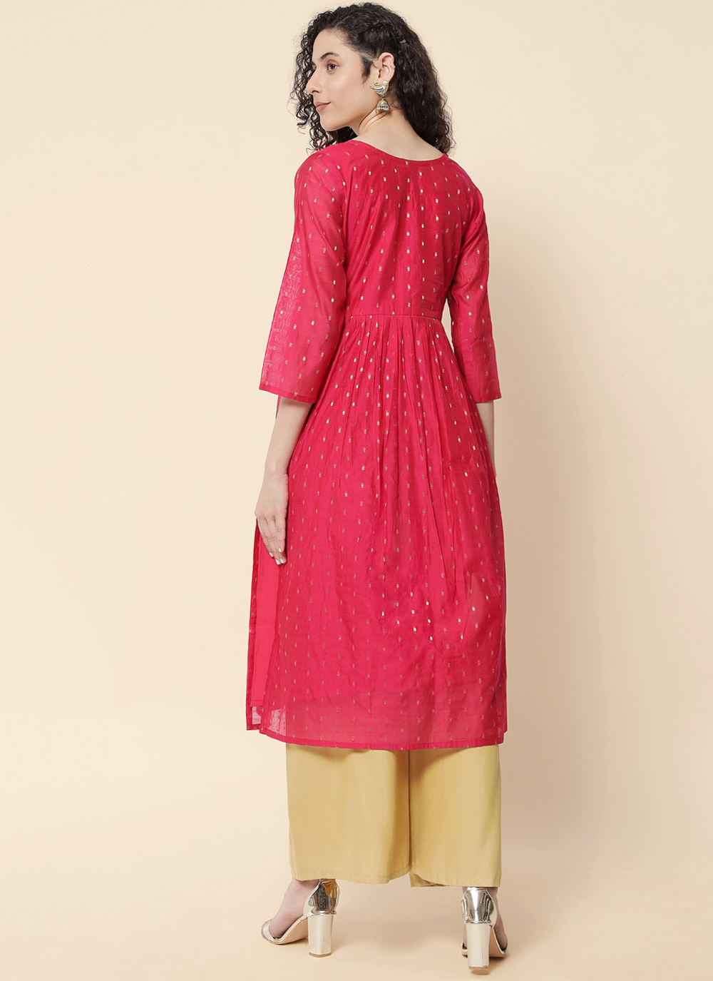 Bring graceful charm to your festive wardrobe with this Chanderi Pink Embroidered Party Trendy Kurti. Crafted from rich Chanderi fabric, it offers a smooth texture with a subtle shine that enhances its elegant appeal.